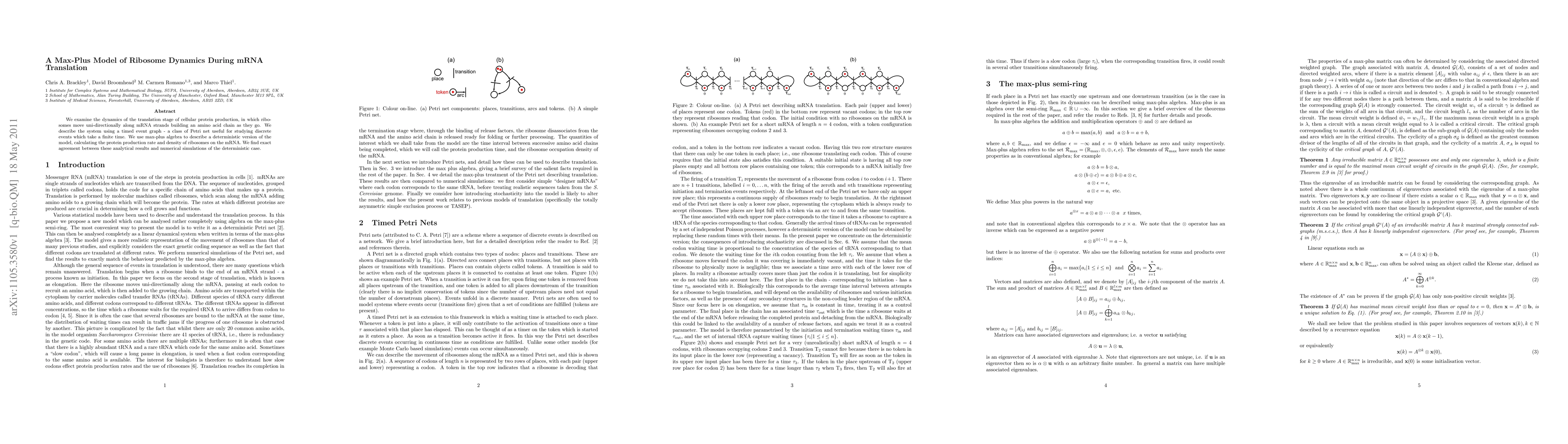 We examine the dynamics of the translation stage of cellular protein production, in which ribosomes move uni-directionally along mRNA strands building an amino acid chain as they go. We describe the system using a timed event graph - a class of Petri net useful for studying discrete events which take a finite time. We use max-plus algebra to describe a deterministic version of the model, calculating the protein production rate and density of ribosomes on the mRNA. We find exact agreement between these analytical results and numerical simulations of the deterministic case.