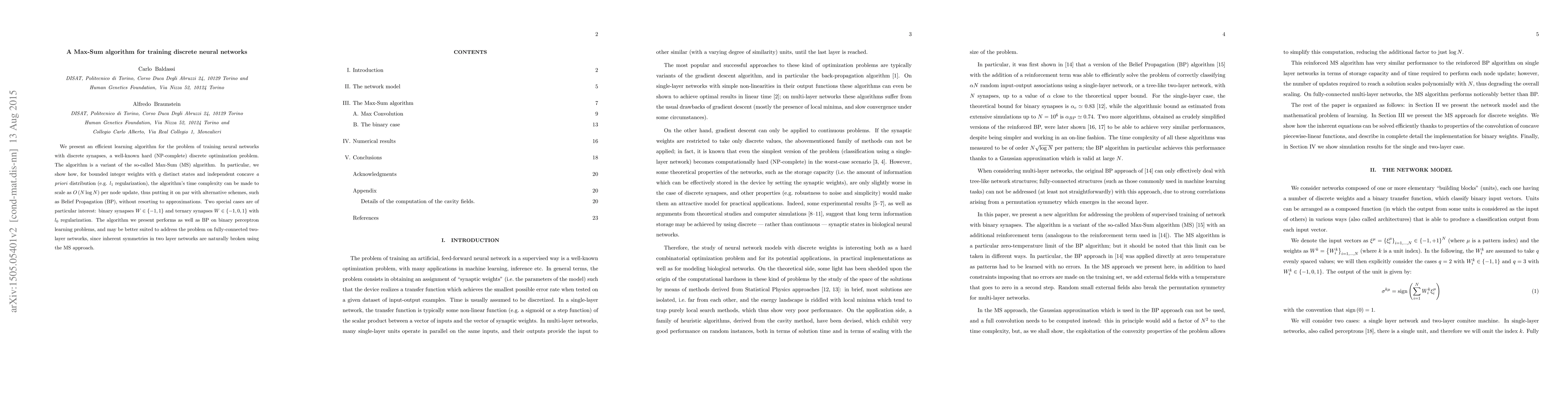 This paper introduces an efficient Max-Sum algorithm for training discrete neural networks, achieving $O\left(N\log N\right)$ time complexity per node update for bounded integer weights. It outperforms Belief Propagation on binary perceptron learning and is well-suited for fully-connected two-layer networks due to its handling of inherent symmetries.