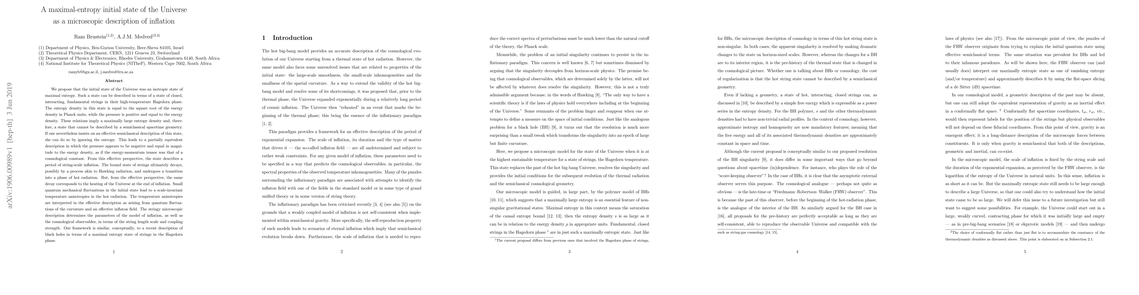 We propose that the initial state of the Universe was an isotropic state of maximal entropy. Such a state can be described in terms of a state of closed, interacting, fundamental strings in their high-temperature Hagedorn phase. The entropy density in this state is equal to the square root of the energy density in Planck units, while the pressure is positive and equal to the energy density. These relations imply a maximally large entropy density and, therefore, a state that cannot be described by a semiclassical spacetime geometry. If one nevertheless insists on an effective semiclassical description of this state, she can do so by ignoring the entropy. This leads to a partially equivalent description in which the pressure appears to be negative and equal in magnitude to the energy density, as if the energy-momentum tensor was that of a cosmological constant. From this effective perspective, the state describes a period of string-scale inflation. The bound state of strings ultimately decays, possibly by a process akin to Hawking radiation, and undergoes a transition into a phase of hot radiation. But, from the effective perspective, the same decay corresponds to the heating of the Universe at the end of inflation. Small quantum mechanical fluctuations in the initial state lead to scale-invariant temperature anisotropies in the hot radiation. The temperature anisotropies are interpreted in the effective description as arising from quantum fluctuations of the curvature and an effective inflaton field. The stringy microscopic description determines the parameters of the model of inflation, as well as the cosmological observables, in terms of the string length scale and coupling strength. Our framework is similar, conceptually, to a recent description of black holes in terms of a maximal entropy state of strings in the Hagedorn phase.