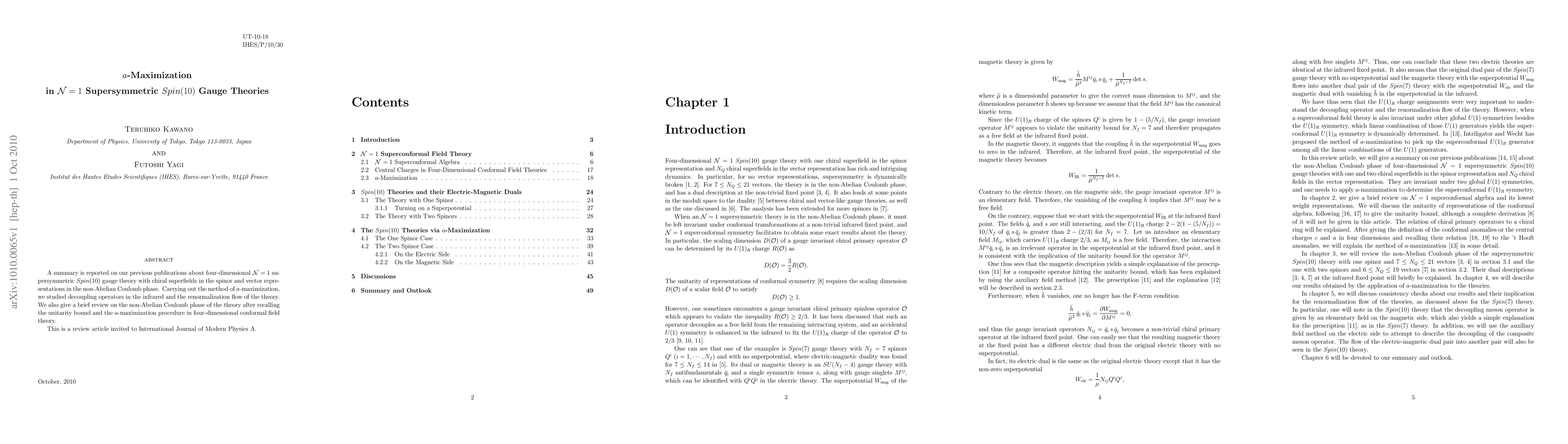 This paper reviews previous findings on four-dimensional N=1 supersymmetric Spin(10) gauge theories, focusing on the non-Abelian Coulomb phase and the a-maximization method to study decoupling operators and renormalization flow. It also briefly revisits the unitarity bound and a-maximization procedure in four-dimensional conformal field theory.