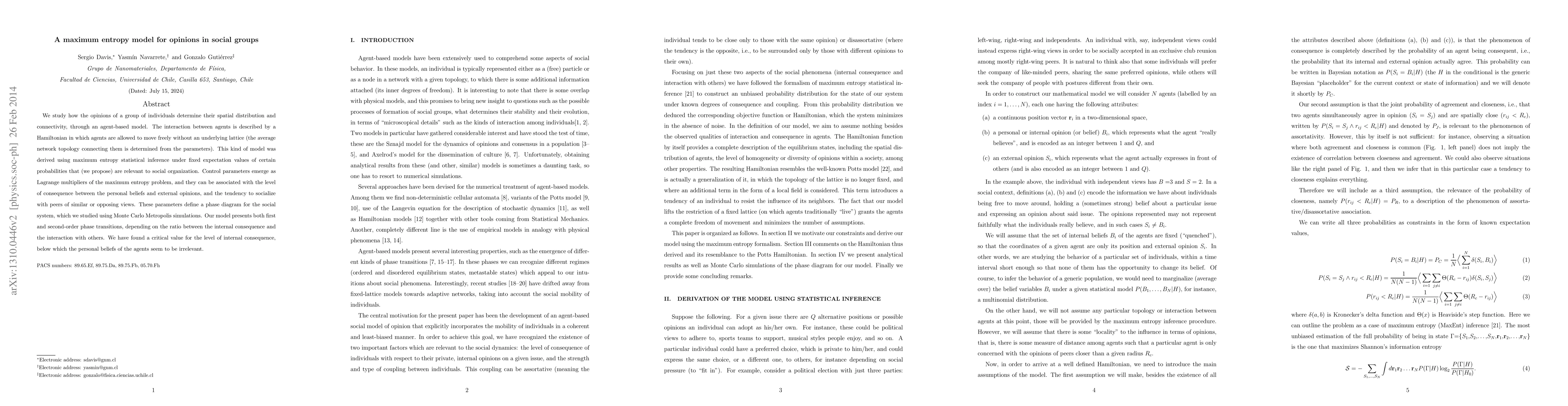 We study how the opinions of a group of individuals determine their spatial distribution and connectivity, through an agent-based model. The interaction between agents is described by a Potts-like Hamiltonian in which agents are allowed to move freely without an underlying lattice (the average network topology connecting them is determined from the parameters). This kind of model was derived using maximum entropy statistical inference under fixed expectation values of certain probabilities that (we propose) are relevant to social organization. Control parameters emerge as Lagrange multipliers of the maximum entropy problem, and they can be associated with the level of consequence between the personal beliefs and external opinions, and the tendency to socialize with peers of similar or opposing views. These parameters define a phase diagram for the social system, which we studied using Monte Carlo Metropolis simulations. Our model presents both first and second-order phase transitions, depending on the ratio between the internal consequence and the interaction with others. We have found a critical value for the level of internal consequence, below which the personal beliefs of the agents seem to be irrelevant.