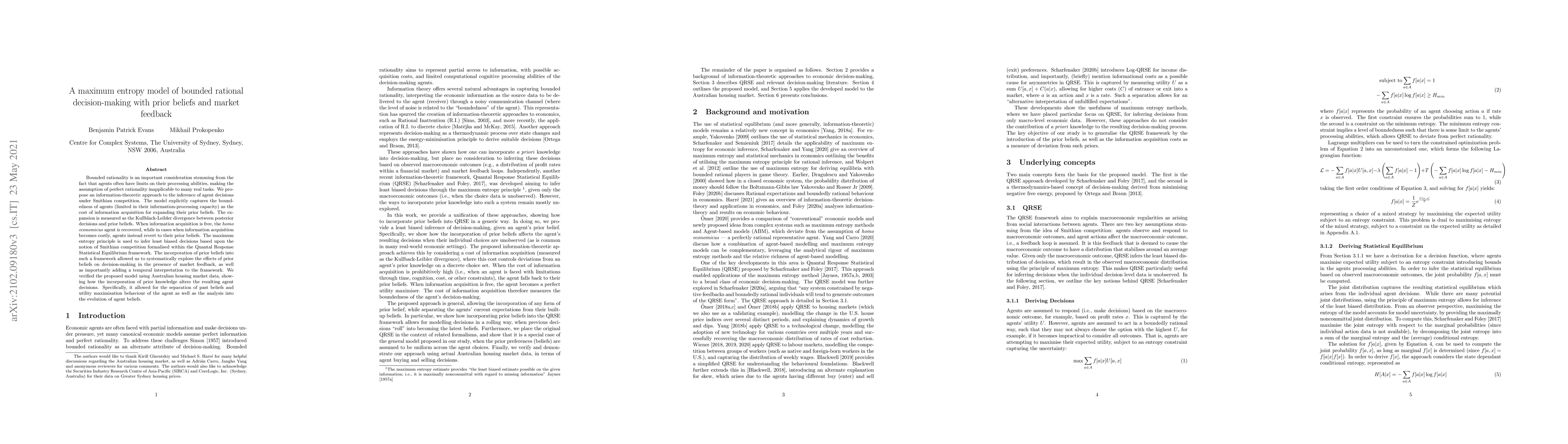 Bounded rationality is an important consideration stemming from the fact that agents often have limits on their processing abilities, making the assumption of perfect rationality inapplicable to many real tasks. We propose an information-theoretic approach to the inference of agent decisions under Smithian competition. The model explicitly captures the boundedness of agents (limited in their information-processing capacity) as the cost of information acquisition for expanding their prior beliefs. The expansion is measured as the Kullblack-Leibler divergence between posterior decisions and prior beliefs. When information acquisition is free, the homo economicus agent is recovered, while in cases when information acquisition becomes costly, agents instead revert to their prior beliefs. The maximum entropy principle is used to infer least-biased decisions based upon the notion of Smithian competition formalised within the Quantal Response Statistical Equilibrium framework. The incorporation of prior beliefs into such a framework allowed us to systematically explore the effects of prior beliefs on decision-making in the presence of market feedback, as well as importantly adding a temporal interpretation to the framework. We verified the proposed model using Australian housing market data, showing how the incorporation of prior knowledge alters the resulting agent decisions. Specifically, it allowed for the separation of past beliefs and utility maximisation behaviour of the agent as well as the analysis into the evolution of agent beliefs.