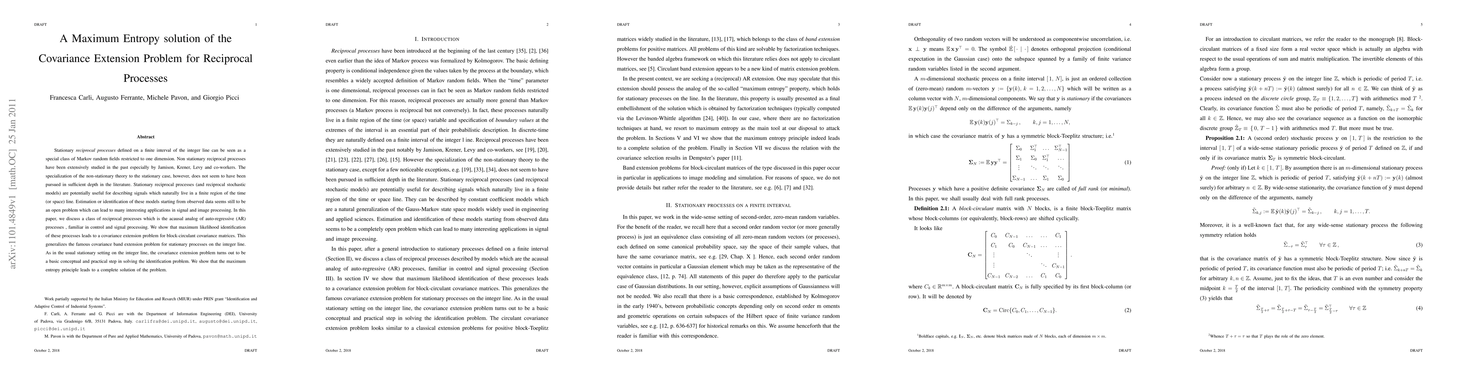 Stationary reciprocal processes defined on a finite interval of the integer line can be seen as a special class of Markov random fields restricted to one dimension. Non stationary reciprocal processes have been extensively studied in the past especially by Jamison, Krener, Levy and co-workers. The specialization of the non-stationary theory to the stationary case, however, does not seem to have been pursued in sufficient depth in the literature. Stationary reciprocal processes (and reciprocal stochastic models) are potentially useful for describing signals which naturally live in a finite region of the time (or space) line. Estimation or identification of these models starting from observed data seems still to be an open problem which can lead to many interesting applications in signal and image processing. In this paper, we discuss a class of reciprocal processes which is the acausal analog of auto-regressive (AR) processes, familiar in control and signal processing. We show that maximum likelihood identification of these processes leads to a covariance extension problem for block-circulant covariance matrices. This generalizes the famous covariance band extension problem for stationary processes on the integer line. As in the usual stationary setting on the integer line, the covariance extension problem turns out to be a basic conceptual and practical step in solving the identification problem. We show that the maximum entropy principle leads to a complete solution of the problem.
