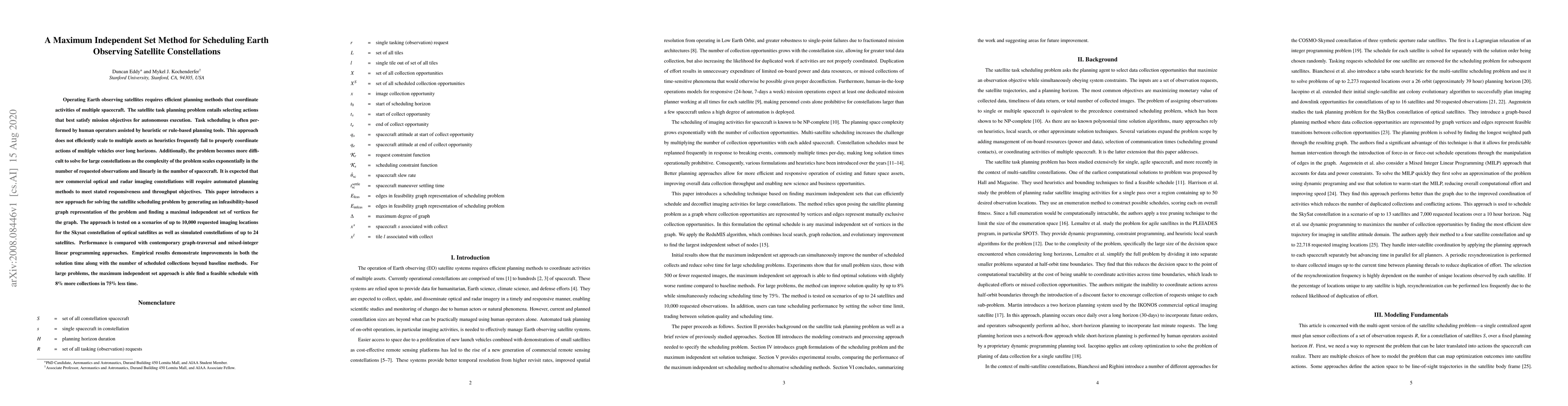 A new approach for scheduling Earth observing satellite constellations efficiently is introduced, using a maximum independent set method to find optimal schedules in 75% less time than baseline methods.