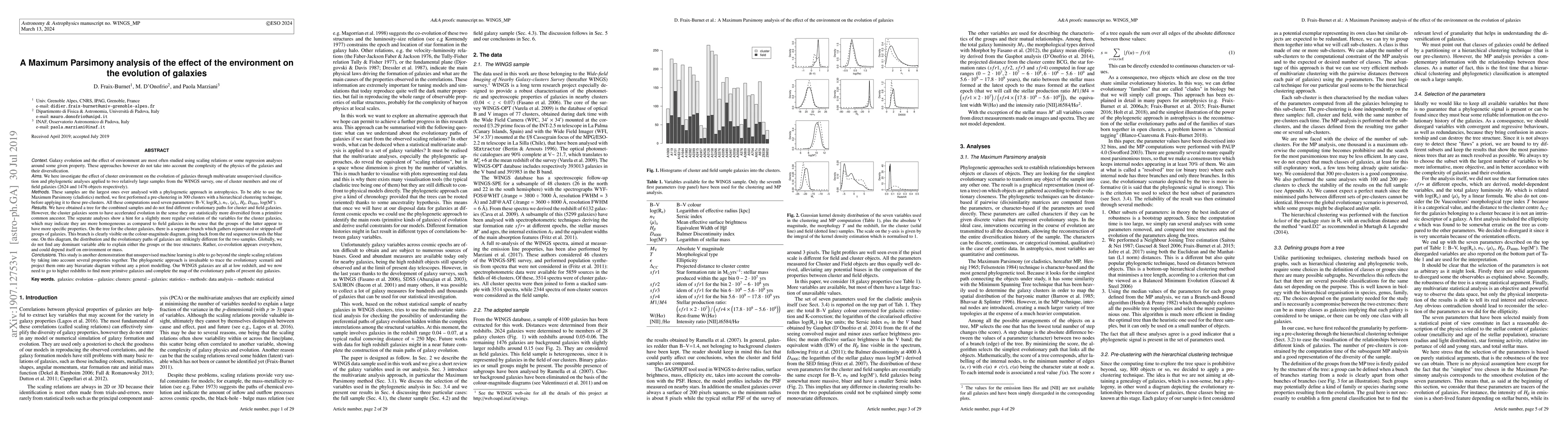 Context. Galaxy evolution and the effect of environment are most often studied using scaling relations or some regression analyses around some given property. These approaches however do not take into account the complexity of the physics of the galaxies and their diversification. Aims. We here investigate the effect of cluster environment on the evolution of galaxies through multivariate unsupervised classification and phylogenetic analyses applied to two relatively large samples from the WINGS survey, one of cluster members and one of field galaxies (2624 and 1476 objects respectively). Methods. These samples are the largest ones ever analysed with a phylogenetic approach in astrophysics. To be able to use the Maximum Parsimony (cladistics) method, we first performed a pre-clustering in 300 clusters with a hierarchical clustering technique, before applying it to these pre-clusters. All these computations used seven parameters: B-V, log(Re), nV , $\mu$e , H$\beta$ , D4000 , log(M *). Results. We have obtained a tree for the combined samples and do not find different evolutionary paths for cluster and field galaxies. However, the cluster galaxies seem to have accelerated evolution in the sense they are statistically more diversified from a primitive common ancestor. The separate analyses show a hint for a slightly more regular evolution of the variables for the cluster galaxies, which may indicate they are more homogeneous as compared to field galaxies in the sense that the groups of the latter appear to have more specific properties. On the tree for the cluster galaxies, there is a separate branch which gathers rejunevated or stripped-off groups of galaxies. This branch is clearly visible on the colour-magnitude diagram, going back from the red sequence towards the blue one. On this diagram, the distribution and the evolutionary paths of galaxies are strikingly different for the two samples. Globally, we do not find any dominant variable able to explain either the groups or the tree structures. Rather, co-evolution appears everywhere, and could depend itself on environment or mass. Conclusions. This study is another demonstration that unsupervised machine learning is able to go beyond the simple scaling relations by taking into account several properties together. The phylogenetic approach is invaluable to trace the evolutionary scenarii and project them onto any biavariate diagram without any a priori modelling. Our WINGS galaxies are all at low redshift, and we now need to go to higher redshfits to find more primitve galaxies and complete the map of the evolutionary paths of present day galaxies.