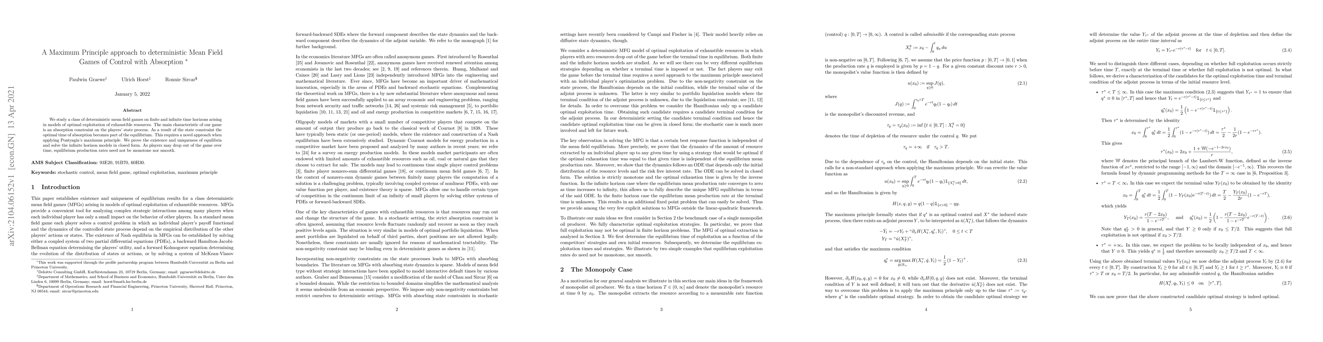 We study a class of deterministic mean field games on finite and infinite time horizons arising in models of optimal exploitation of exhaustible resources. The main characteristic of our game is an absorption constraint on the players' state process. As a result of the state constraint the optimal time of absorption becomes part of the equilibrium. This requires a novel approach when applying Pontyagin's maximum principle. We prove the existence and uniqueness of equilibria and solve the infinite horizon models in closed form. As players may drop out of the game over time, equilibrium production rates need not be monotone nor smooth.