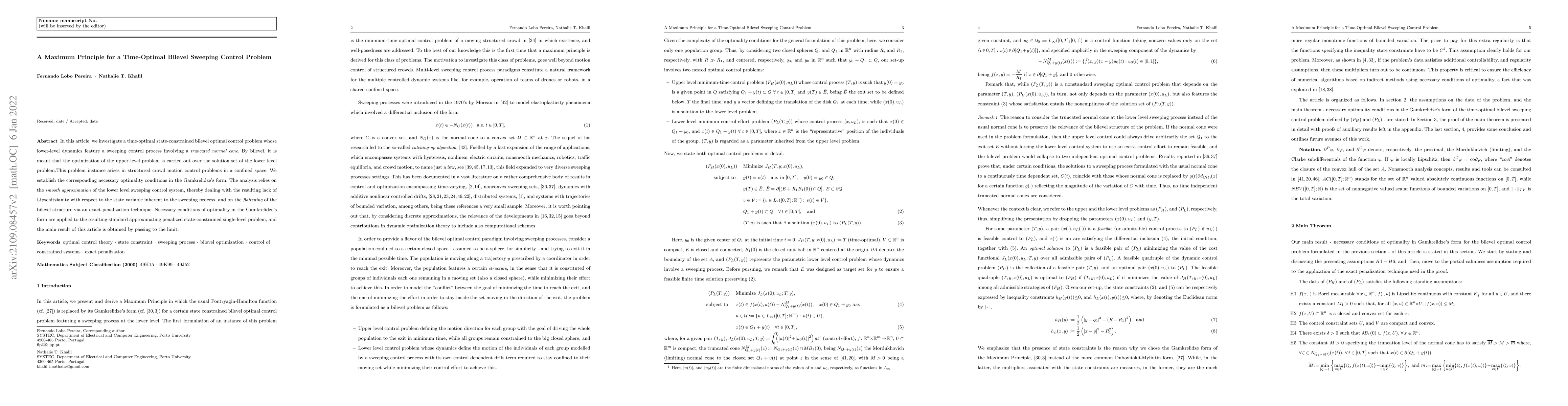 Researchers develop a maximum principle for optimizing crowd motion in confined spaces using time-optimal bilevel sweeping control. They establish necessary optimality conditions and use smooth approximation and penalization techniques to overcome challenges with the original problem's non-Lipschitzian dynamics.