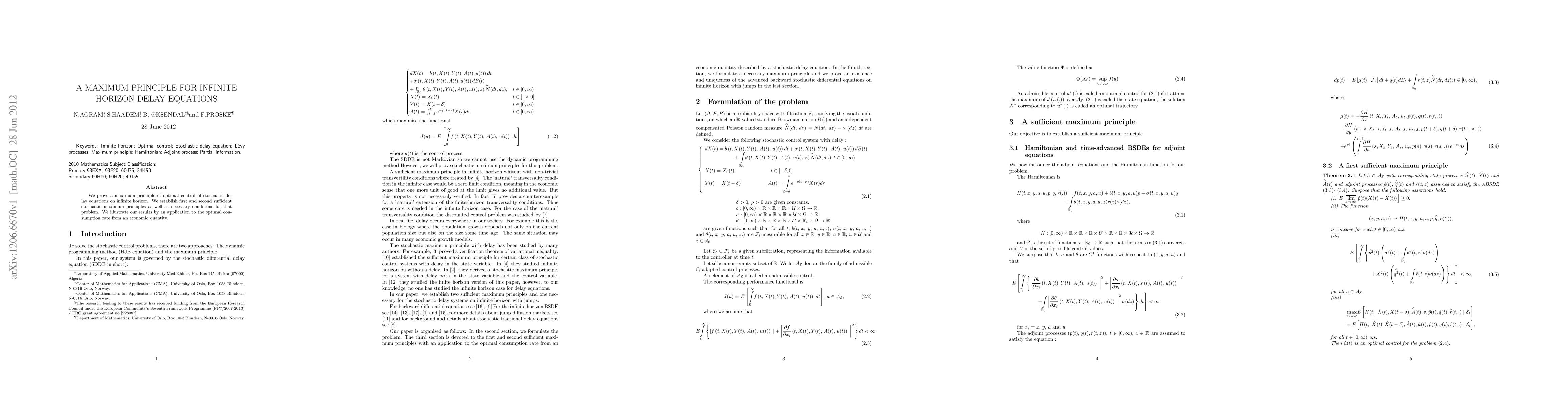 Researchers prove a maximum principle for optimal control of stochastic delay equations on infinite horizon, providing sufficient conditions for maximizing consumption rates in economic scenarios.