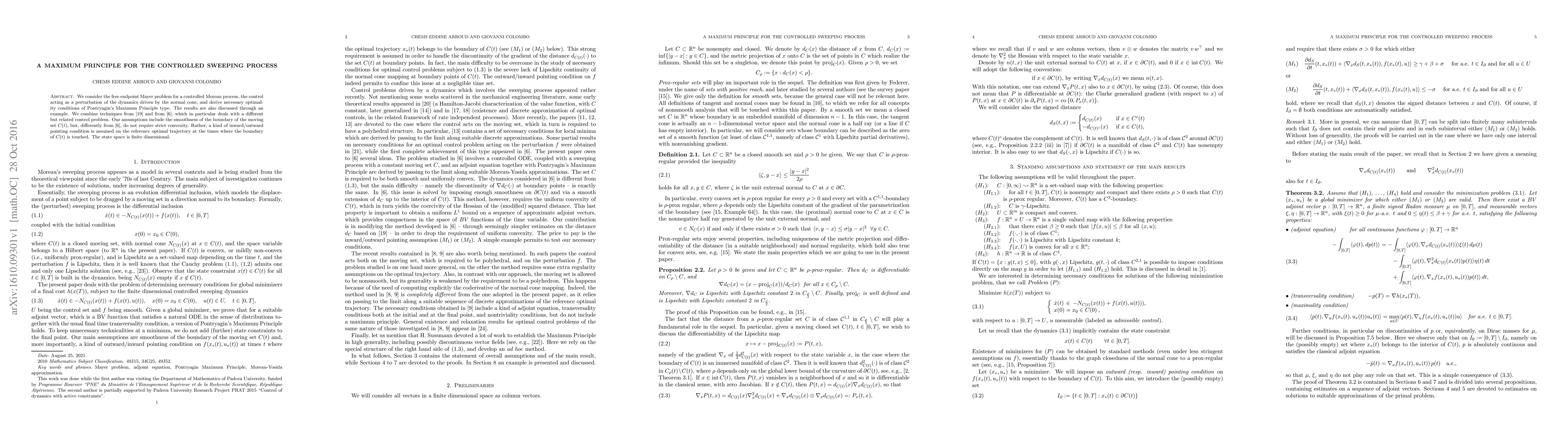 We consider the free endpoint Mayer problem for a controlled Moreau process, the control acting as a perturbation of the dynamics driven by the normal cone, and derive necessary optimality conditions of Pontryagin's Maximum Principle type. The results are also discussed through an example. We combine techniques from M. Sene, L. Thibault, Journal of Nonlinear and Convex Analysis 15 (2014) and from M. Brokate and P. Krejci, Discrete and continuous dynamical systems series B. Volume 18 (2013), 331-348, which in particular deals with a different but related control problem. Our assumptions include the smoothness of the boundary of the moving set $C(t)$, but do not require its strict convexity. Rather, a kind of inward/outward pointing condition is assumed on the reference optimal trajectory at the times where the boundary of $C(t)$ is touched. The state space is finite dimensional.
