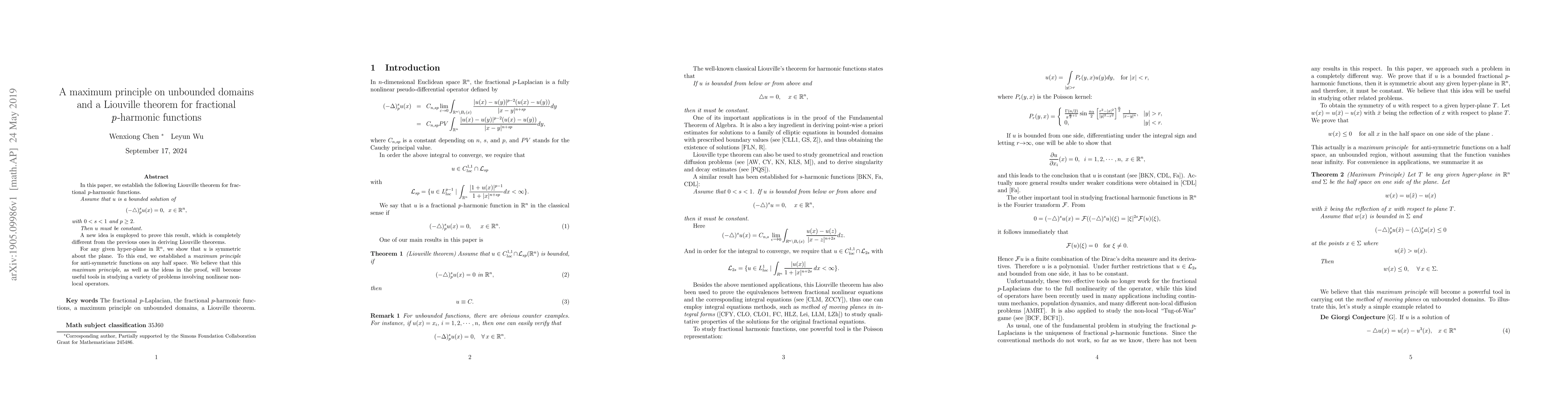 This paper establishes a Liouville theorem for fractional \( p \)-harmonic functions, proving that bounded solutions of \( (-\lap)^s_p u(x) = 0 \) in \( \mathbb{R}^n \) must be constant. A novel maximum principle for anti-symmetric functions and a symmetry argument about hyperplanes are employed in the proof.
