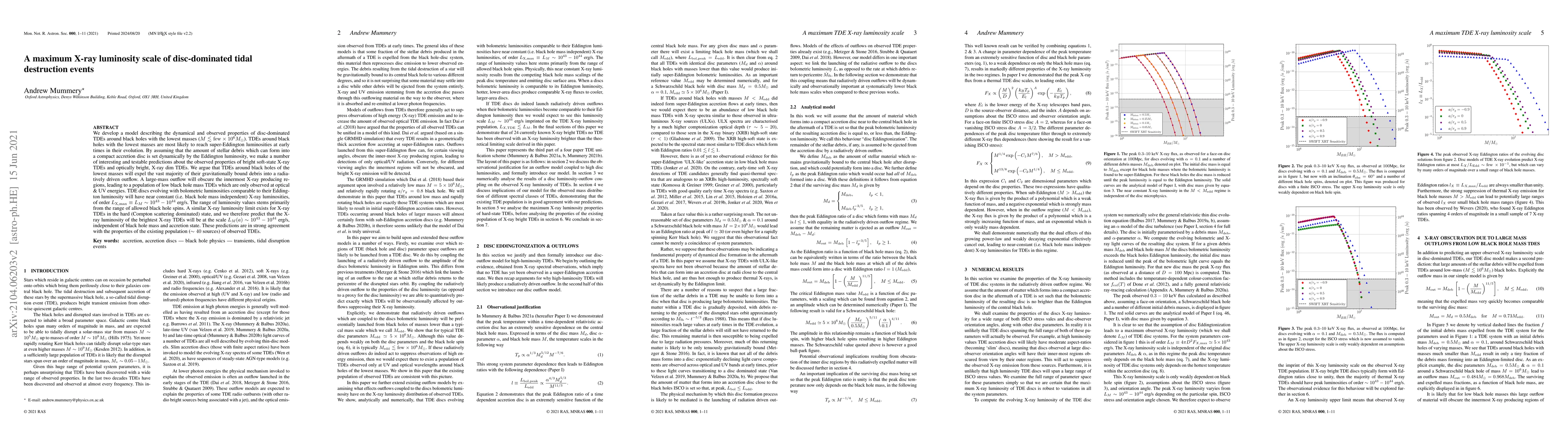 We develop a model describing the dynamical and observed properties of disc-dominated TDEs around black holes with the lowest masses ($M \lesssim {\rm few} \times 10^{6} M_\odot$). TDEs around black holes with the lowest masses are most likely to reach super-Eddington luminosities at early times in their evolution. By assuming that the amount of stellar debris which can form into a compact accretion disc is set dynamically by the Eddington luminosity, we make a number of interesting and testable predictions about the observed properties of bright soft-state X-ray TDEs and optically bright, X-ray dim TDEs. We argue that TDEs around black holes of the lowest masses will expel the vast majority of their gravitationally bound debris into a radiatively driven outflow. A large-mass outflow will obscure the innermost X-ray producing regions, leading to a population of low black hole mass TDEs which are only observed at optical \& UV energies. TDE discs evolving with bolometric luminosities comparable to their Eddington luminosity will have near constant (i.e. black hole mass independent) X-ray luminosities, of order $L_{\rm X, max} \equiv L_M \sim 10^{43} - 10^{44}$ erg/s. The range of luminosity values stems primarily from the range of allowed black hole spins. A similar X-ray luminosity limit exists for X-ray TDEs in the hard (Compton scattering dominated) state, and we therefore predict that the X-ray luminosity of the brightest X-ray TDEs will be at the scale $L_M(a) \sim 10^{43}-10^{44}$ erg/s, independent of black hole mass and accretion state. These predictions are in strong agreement with the properties of the existing population ($\sim 40$ sources) of observed TDEs.