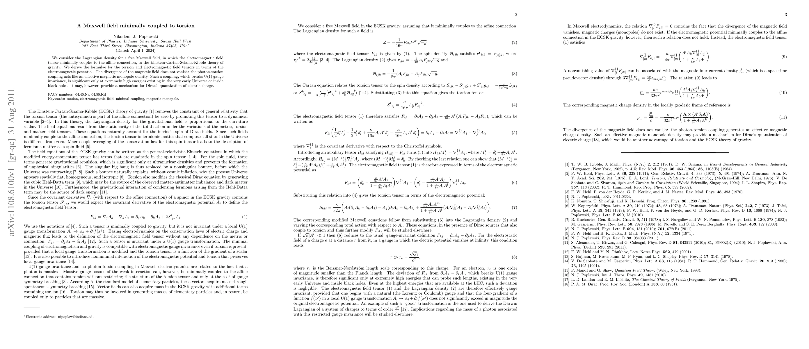We consider the Lagrangian density for a free Maxwell field, in which the electromagnetic field tensor minimally couples to the affine connection, in the Einstein-Cartan-Sciama-Kibble theory of gravity. We derive the formulae for the torsion and electromagnetic field tensors in terms of the electromagnetic potential. The divergence of the magnetic field does not vanish: the photon-torsion coupling acts like an effective magnetic monopole density. Such a coupling, which breaks U(1) gauge invariance, is significant only at extremely high energies existing in the very early Universe or inside black holes. It may, however, provide a mechanism for Dirac's quantization of electric charge.