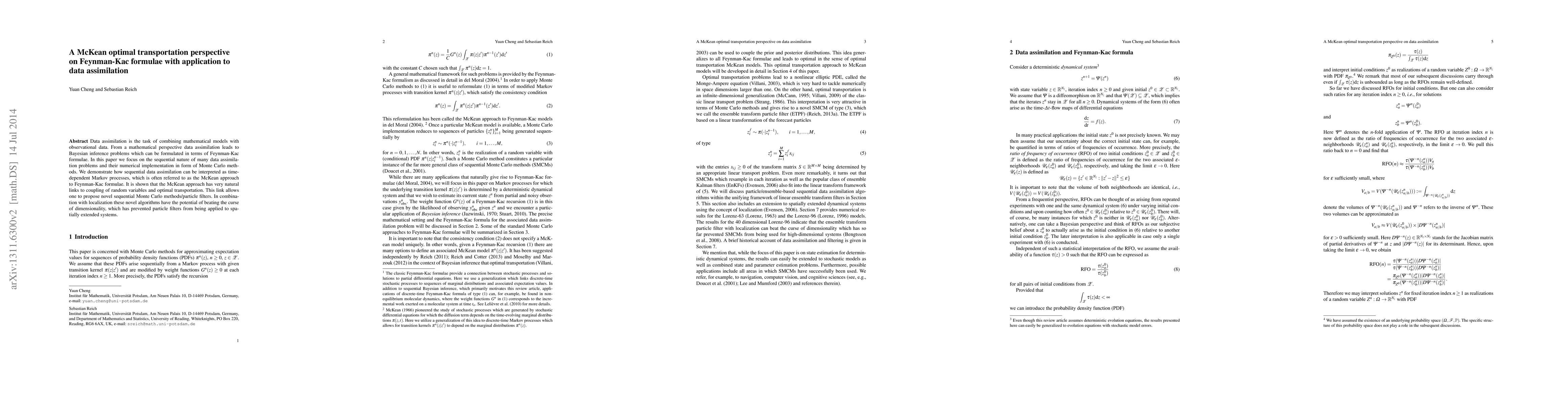 Data assimilation is the task of combining mathematical models with observational data. From a mathematical perspective data assimilation leads to Bayesian inference problems which can be formulated in terms of Feynman-Kac formulae. In this paper we focus on the sequential nature of many data assimilation problems and their numerical implementation in form of Monte Carlo methods. We demonstrate how sequential data assimilation can be interpreted as time-dependent Markov processes, which is often referred to as the McKean approach to Feynman-Kac formulae. It is shown that the McKean approach has very natural links to coupling of random variables and optimal transportation. This link allows one to propose novel sequential Monte Carlo methods/particle filters. In combination with localization these novel algorithms have the potential of beating the curse of dimensionality, which has prevented particle filters from being applied to spatially extended systems.