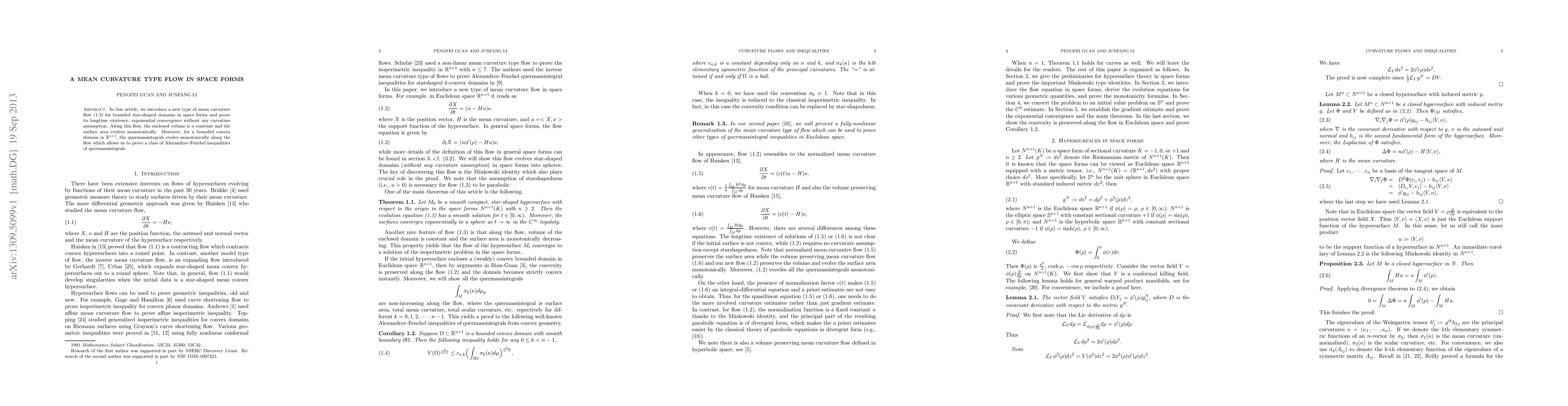 In this article, we introduce a new type of mean curvature flow for bounded star-shaped domains in space forms and prove its longtime existence, exponential convergence without any curvature assumption. Along this flow, the enclosed volume is a constant and the surface area evolves monotonically. Moreover, for a bounded convex domain in R n+1, the quermassintegrals evolve monotonically along the flow which allows us to prove a class of Alexandrov-Fenchel inequalities of quermassintegrals.