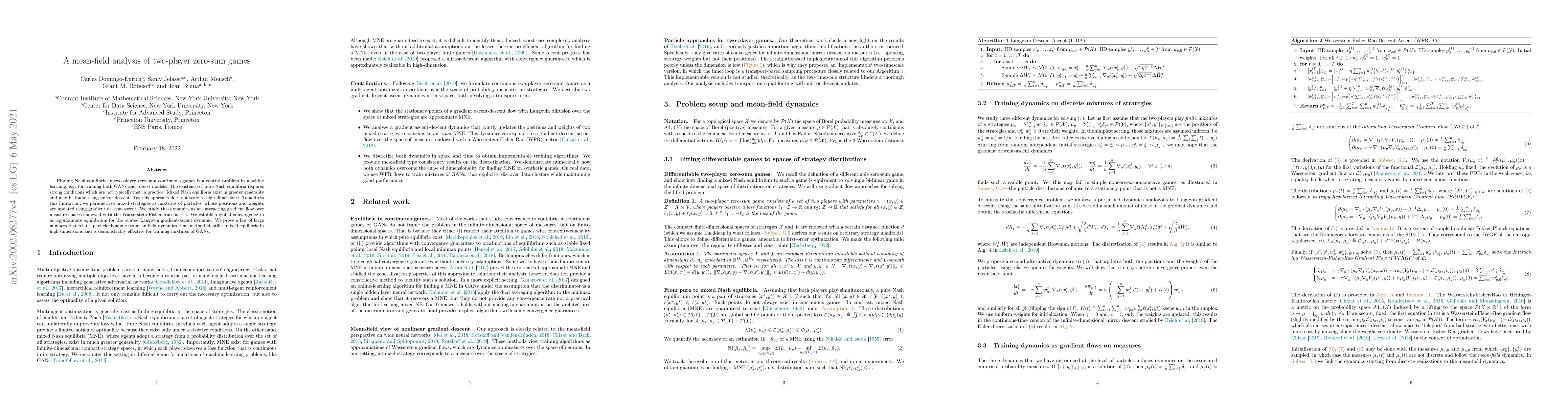 This paper proposes a mean-field analysis for finding mixed Nash equilibria in high-dimensional two-player zero-sum games, using gradient descent-ascent on particle representations. It establishes global convergence to approximate equilibria and demonstrates effectiveness in training mixtures of GANs.