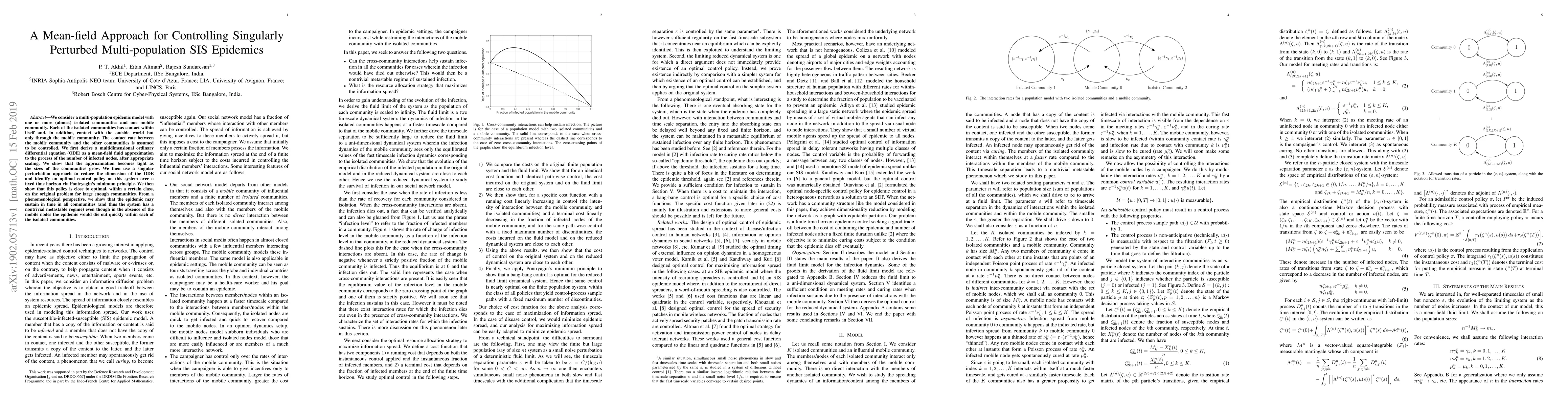 We consider a multi-population epidemic model with one or more (almost) isolated communities and one mobile community. Each of the isolated communities has contact within itself and, in addition, contact with the outside world but only through the mobile community. The contact rate between the mobile community and the other communities is assumed to be controlled. We first derive a multidimensional ordinary differential equation (ODE) as a mean-field fluid approximation to the process of the number of infected nodes, after appropriate scaling. We show that the approximation becomes tight as the sizes of the communities grow. We then use a singular perturbation approach to reduce the dimension of the ODE and identify an optimal control policy on this system over a fixed time horizon via Pontryagin's minimum principle. We then show that this policy is close to optimal, within a certain class, on the original problem for large enough communities. From a phenomenological perspective, we show that the epidemic may sustain in time in all communities (and thus the system has a nontrivial metastable regime) even though in the absence of the mobile nodes the epidemic would die out quickly within each of the isolated communities.