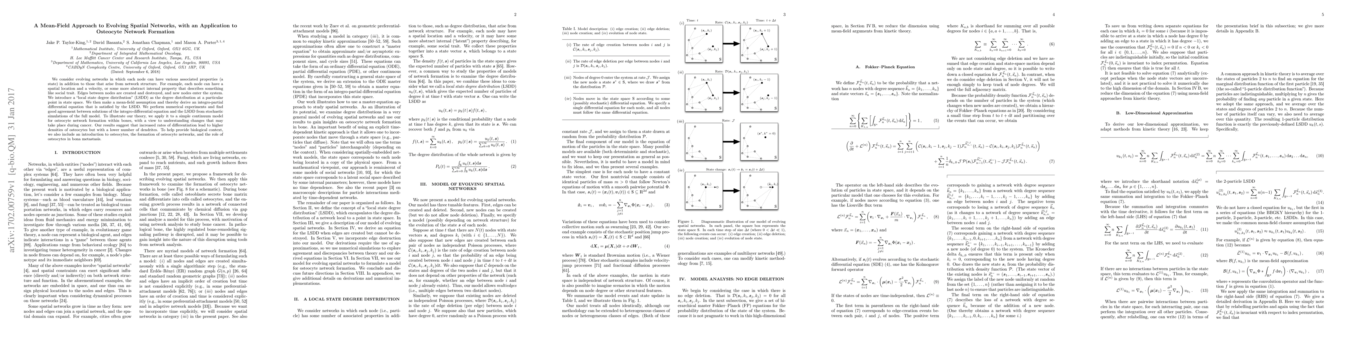 We consider evolving networks in which each node can have various associated properties (a state) in addition to those that arise from network structure. For example, each node can have a spatial location and a velocity, or some more abstract internal property that describes something like social trait. Edges between nodes are created and destroyed, and new nodes enter the system. We introduce a "local state degree distribution" (LSDD) as the degree distribution at a particular point in state space. We then make a mean-field assumption and thereby derive an integro-partial differential equation that is satisfied by the LSDD. We perform numerical experiments and find good agreement between solutions of the integro-differential equation and the LSDD from stochastic simulations of the full model. To illustrate our theory, we apply it to a simple continuum model for osteocyte network formation within bones, with a view to understanding changes that may take place during cancer. Our results suggest that increased rates of differentiation lead to higher densities of osteocytes but with a lower number of dendrites. To help provide biological context, we also include an introduction to osteocytes, the formation of osteocyte networks, and the role of osteocytes in bona metastasis.