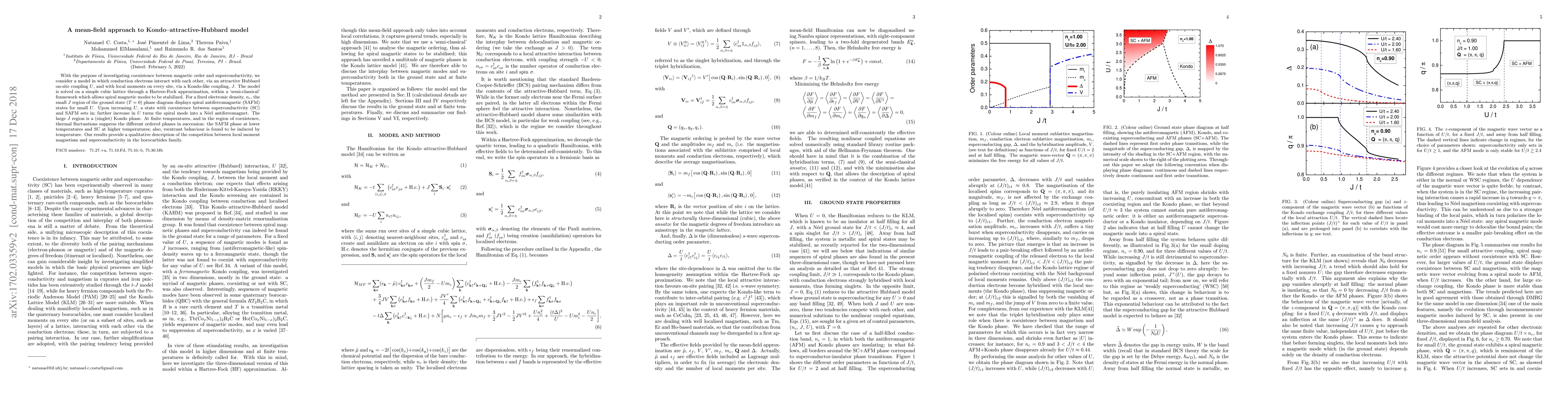 This study employs a mean-field approach to investigate the Kondo-attractive-Hubbard model, revealing coexistence between spiral antiferromagnetism and superconductivity under certain conditions. The model shows a transition from spiral to Néel antiferromagnetism with increasing on-site interaction, and thermal fluctuations suppress these phases in a temperature-dependent manner.