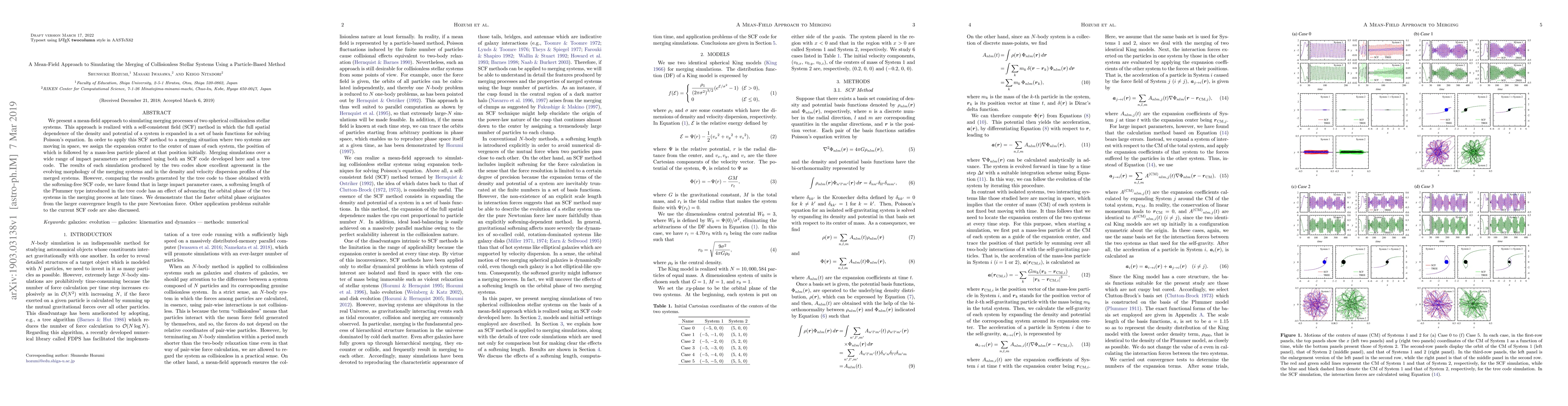 This paper introduces a mean-field approach using a self-consistent field method to simulate the merging of collisionless stellar systems, showing excellent agreement with traditional tree codes. The study highlights the effect of softening length in tree codes on the orbital phase advancement in large impact parameter scenarios.