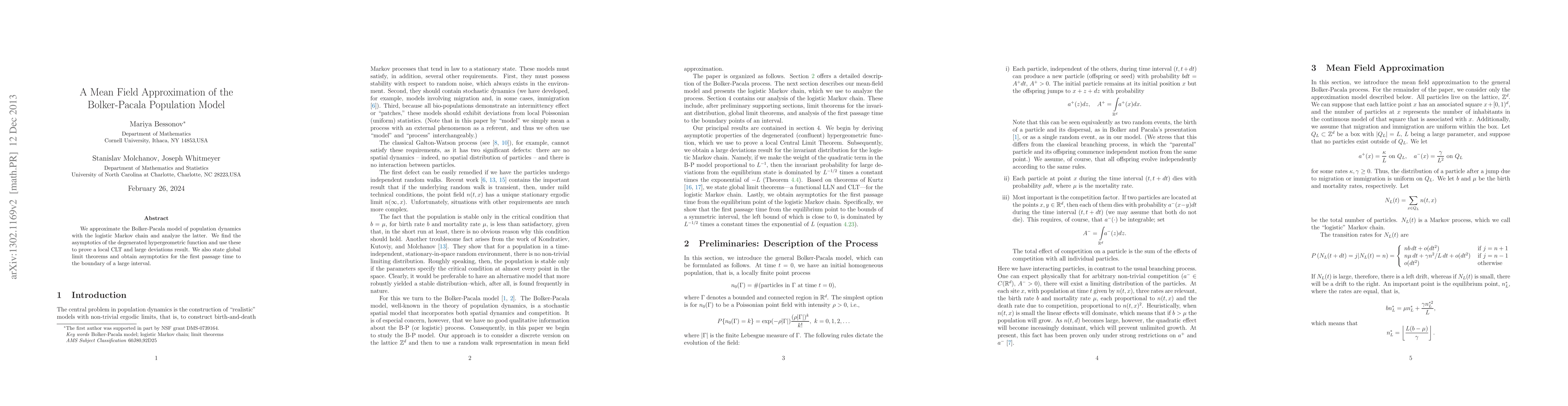 We approximate the Bolker-Pacala model of population dynamics with the logistic Markov chain and analyze the latter. We find the asymptotics of the degenerated hypergeometric function and use these to prove a local CLT and large deviations result. We also state global limit theorems and obtain asymptotics for the first passage time to the boundary of a large interval.