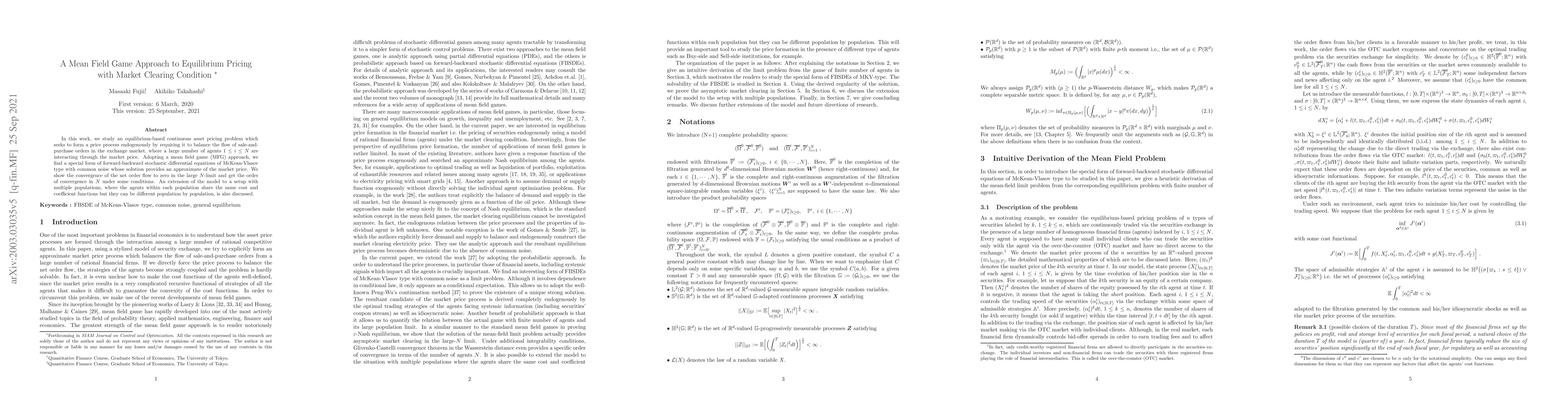 In this work, we study an equilibrium-based continuous asset pricing problem which seeks to form a price process endogenously by requiring it to balance the flow of sales-and-purchase orders in the exchange market, where a large number of agents are interacting through the market price. Adopting a mean field game (MFG) approach, we find a special form of forward-backward stochastic differential equations of McKean-Vlasov type with common noise whose solution provides a good approximate of the market price. We show the convergence of the net order flow to zero in the large N-limit and get the order of convergence in N under some conditions. We also extend the model to a setup with multiple populations where the agents within each population share the same cost and coefficient functions but they can be different population by population.