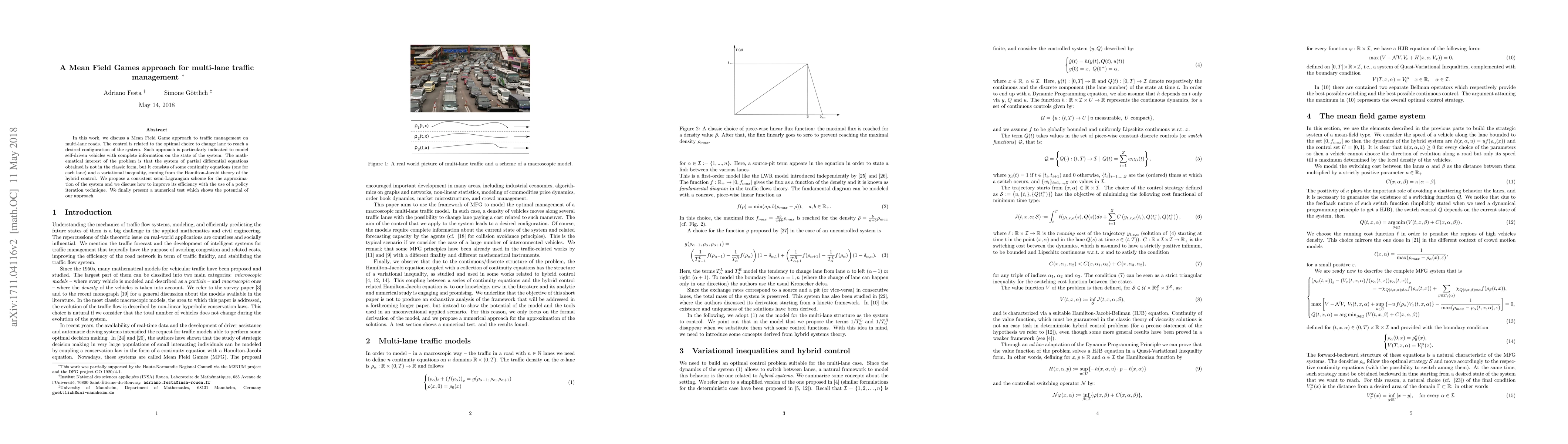 In this work we discuss an Mean Field Games approach to traffic management on multi-lane roads. Such approach is particularly indicated to model self driven vehicles with perfect information of the domain. The mathematical interest of the problem is related to the fact that the system of partial differential equations obtained in this case is not in the classic form, but it consists of two continuity equations (one for each lane) and a variational inequality, coming from the Hamilton-Jacobi theory of the hybrid control.