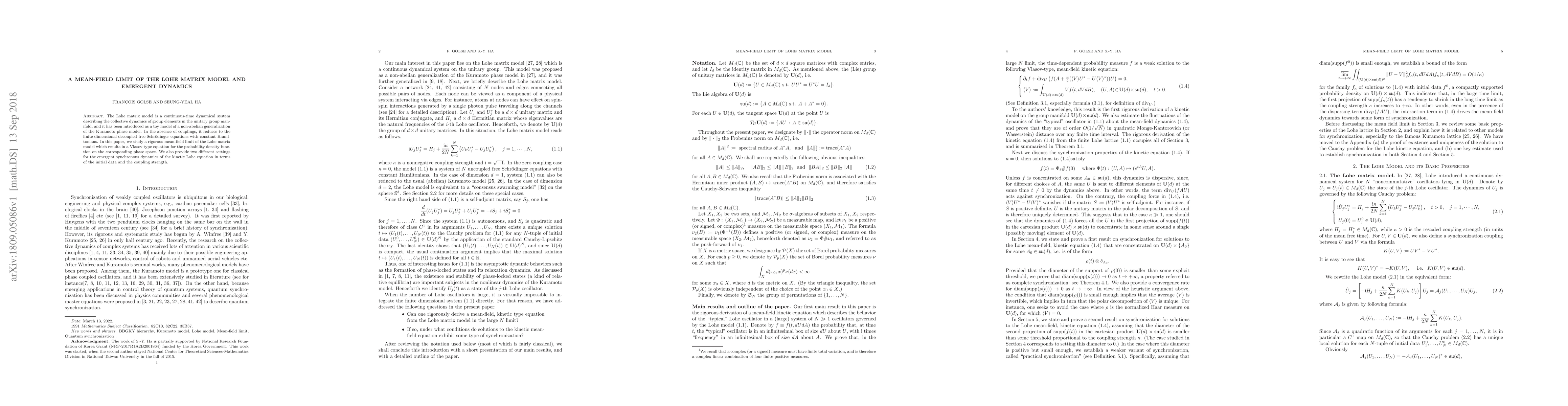 The Lohe matrix model is a continuous-time dynamical system describing the collective dynamics of group elements in the unitary group manifold, and it has been introduced as a toy model of a non abelian generalization of the Kuramoto phase model. In the absence of couplings, it reduces to the finite-dimensional decoupled free Schr\"{o}dinger equations with constant Hamiltonians. In this paper, we study a rigorous mean-field limit of the Lohe matrix model which results in a Vlasov type equation for the probability density function on the corresponding phase space. We also provide two different settings for the emergent synchronous dynamics of the kinetic Lohe equation in terms of the initial data and the coupling strength.