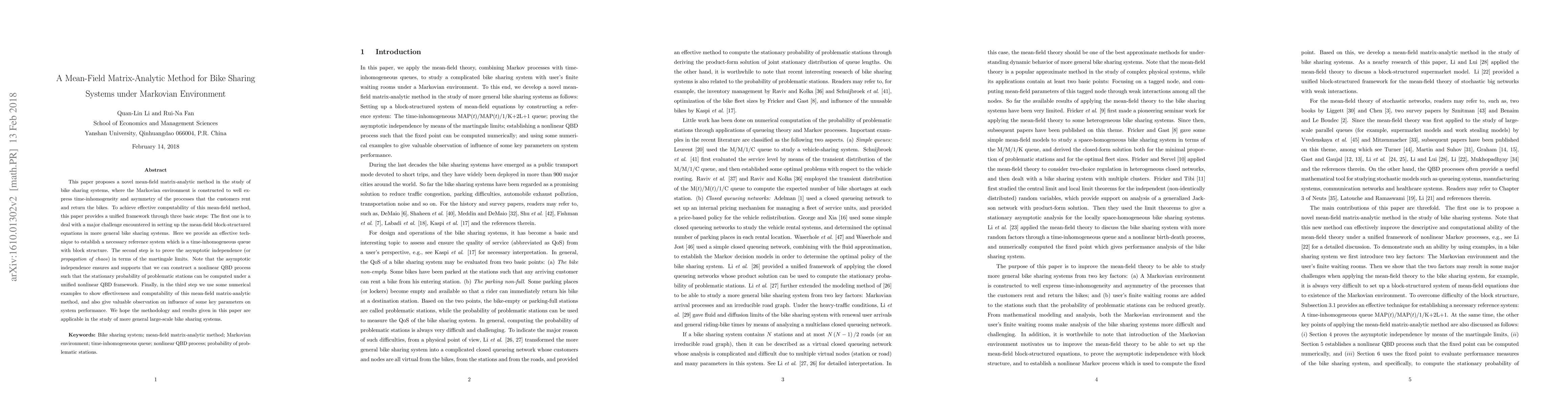 This paper proposes a mean-field matrix-analytic method for studying large-scale bike-sharing systems under Markovian environments, combining mean-field theory with time-inhomogeneous queues and nonlinear QBD processes to analyze performance measures like stationary bike numbers and problematic station probabilities. Numerical examples demonstrate the method's applicability.