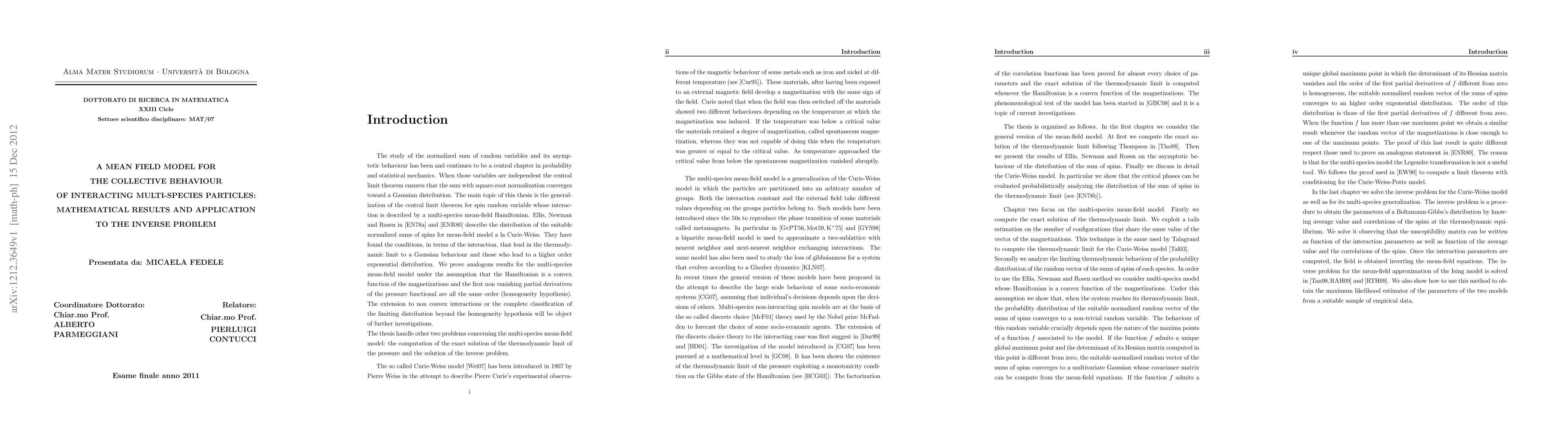 The study of the normalized sum of random variables and its asymptotic behaviour has been and continues to be a central chapter in probability and statistical mechanics. When those variables are independent the central limit theorem ensures that the sum with square-root normalization converges toward a Gaussian distribution. The main topic of this thesis is the generalization of the central limit theorem for spin random variable whose interaction is described by a multi-species mean-field Hamiltonian. We found the conditions, in terms of the interaction, that lead in the thermodynamic limit to a Gaussian behaviour and those who lead to a higher order exponential distribution, under the assumption that the Hamiltonian is a convex function of the magnetizations and the first non vanishing partial derivatives of the pressure functional are all the same order (homogeneity hypothesis). The thesis handle other two problems concerning the multi-species mean-field model: the computation of the exact solution of the thermodynamic limit of the pressure and the solution of the inverse problem.