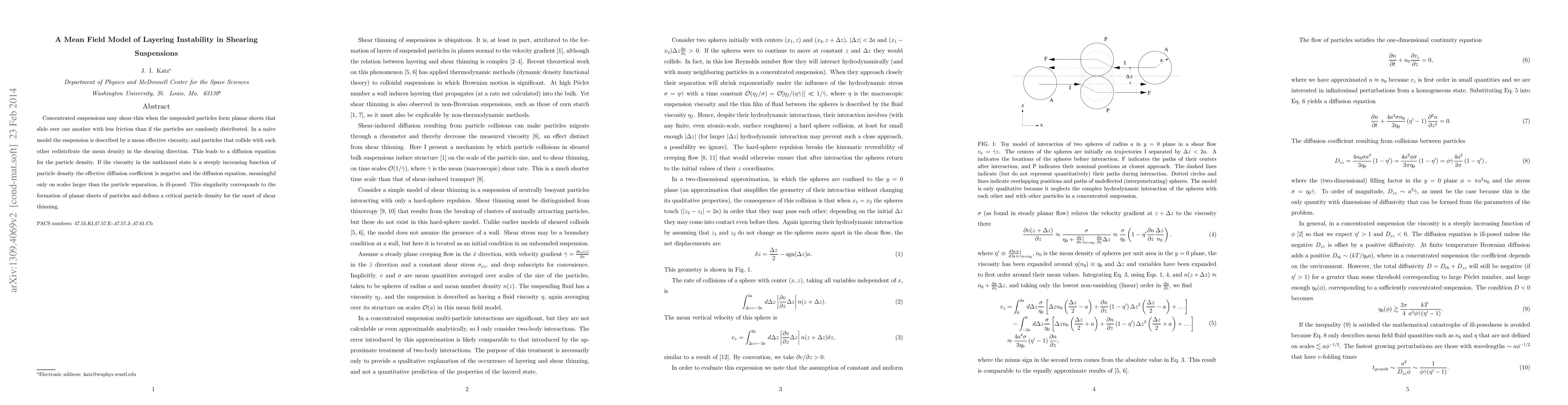 Concentrated suspensions may shear-thin when the suspended particles form planar sheets that slide over one another with less friction than if the particles are randomly distributed. In a na\"ive model the suspension is described by a mean effective viscosity, and particles that collide with each other redistribute the mean density in the shearing direction. This leads to a diffusion equation for the particle density. If the viscosity in the unthinned state is a steeply increasing function of particle density the effective diffusion coefficient is negative and the diffusion equation, meaningful only on scales larger than the particle separation, is ill-posed. This singularity corresponds to the formation of planar sheets of particles and defines a critical particle density for the onset of shear thinning.