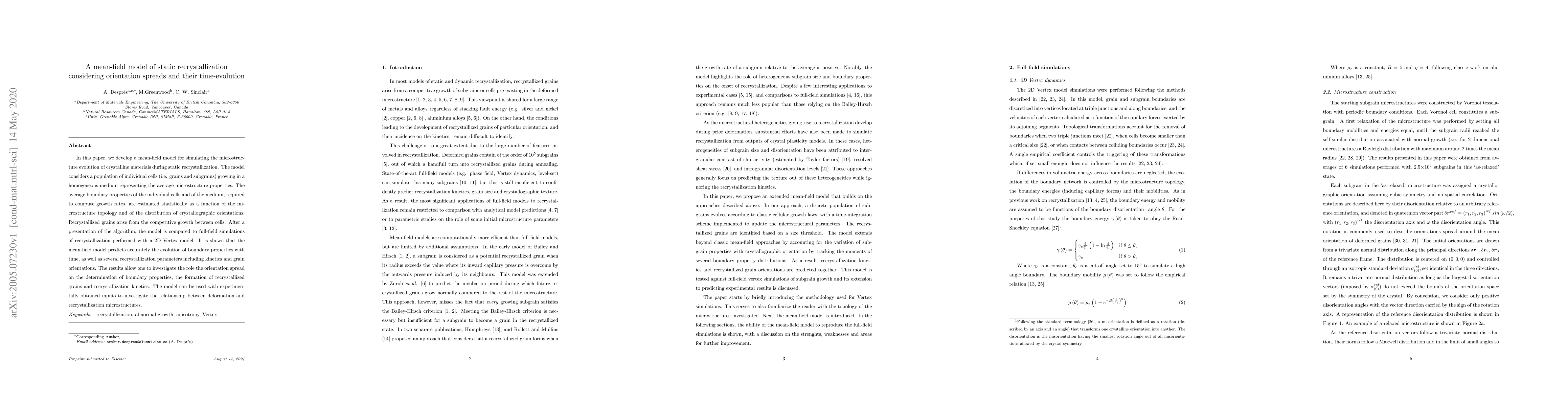 A mean-field model simulates microstructure evolution during static recrystallization, accurately predicting grain formation and boundary properties. The model considers orientation spreads and their time-evolution to investigate the role of orientation on recrystallization kinetics.