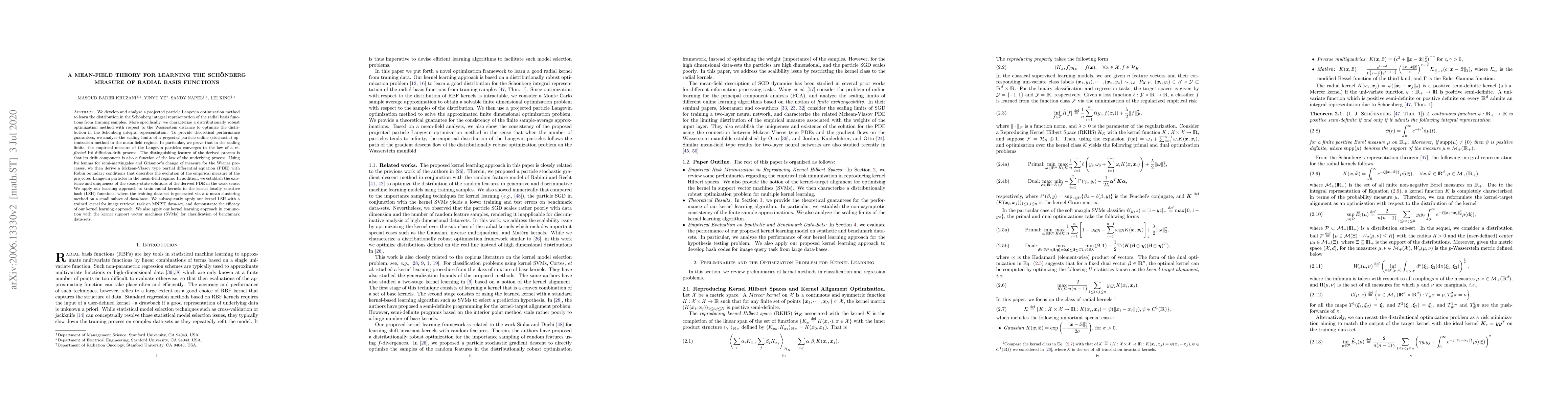 We develop and analyze a projected particle Langevin optimization method to learn the distribution in the Sch\"{o}nberg integral representation of the radial basis functions from training samples. More specifically, we characterize a distributionally robust optimization method with respect to the Wasserstein distance to optimize the distribution in the Sch\"{o}nberg integral representation. To provide theoretical performance guarantees, we analyze the scaling limits of a projected particle online (stochastic) optimization method in the mean-field regime. In particular, we prove that in the scaling limits, the empirical measure of the Langevin particles converges to the law of a reflected It\^{o} diffusion-drift process. Moreover, the drift is also a function of the law of the underlying process. Using It\^{o} lemma for semi-martingales and Grisanov's change of measure for the Wiener processes, we then derive a Mckean-Vlasov type partial differential equation (PDE) with Robin boundary conditions that describes the evolution of the empirical measure of the projected Langevin particles in the mean-field regime. In addition, we establish the existence and uniqueness of the steady-state solutions of the derived PDE in the weak sense. We apply our learning approach to train radial kernels in the kernel locally sensitive hash (LSH) functions, where the training data-set is generated via a $k$-mean clustering method on a small subset of data-base. We subsequently apply our kernel LSH with a trained kernel for image retrieval task on MNIST data-set, and demonstrate the efficacy of our kernel learning approach. We also apply our kernel learning approach in conjunction with the kernel support vector machines (SVMs) for classification of benchmark data-sets.