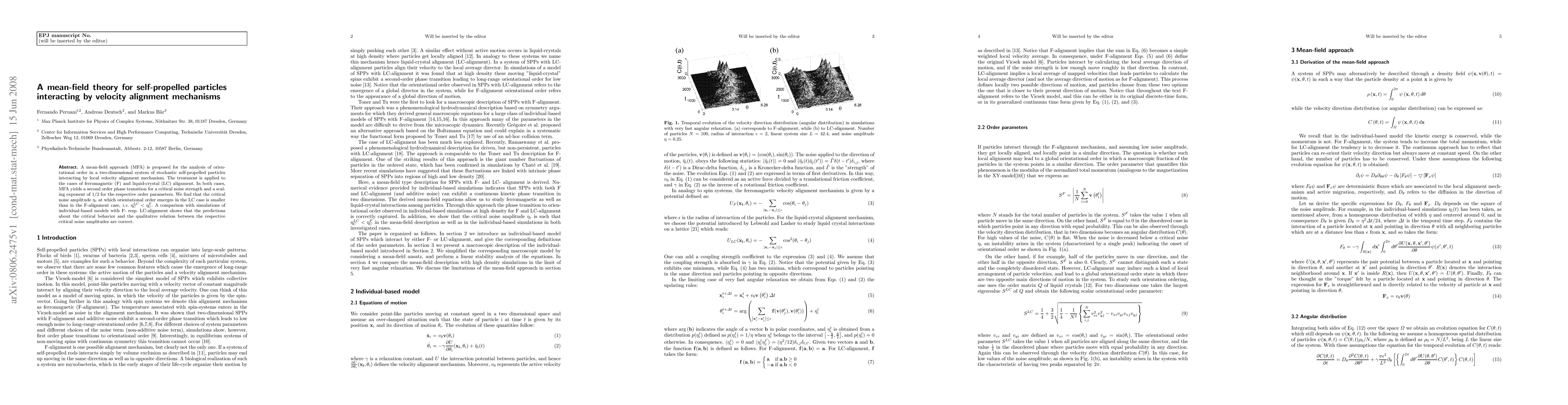 A mean-field approach (MFA) is proposed for the analysis of orientational order in a two-dimensional system of stochastic self-propelled particles interacting by local velocity alignment mechanism. The treatment is applied to the cases of ferromagnetic (F) and liquid-crystal (LC) alignment. In both cases, MFA yields a second order phase transition for a critical noise strength and a scaling exponent of 1/2 for the respective order parameters. We find that the critical noise amplitude $\eta_c$ at which orientational order emerges in the LC case is smaller than in the F-alignment case, i.e. $\eta^{LC}_{C}<\eta^{F}_{C}$. A comparison with simulations of individual-based models with F- resp. LC-alignment shows that the predictions about the critical behavior and the qualitative relation between the respective critical noise amplitudes are correct.