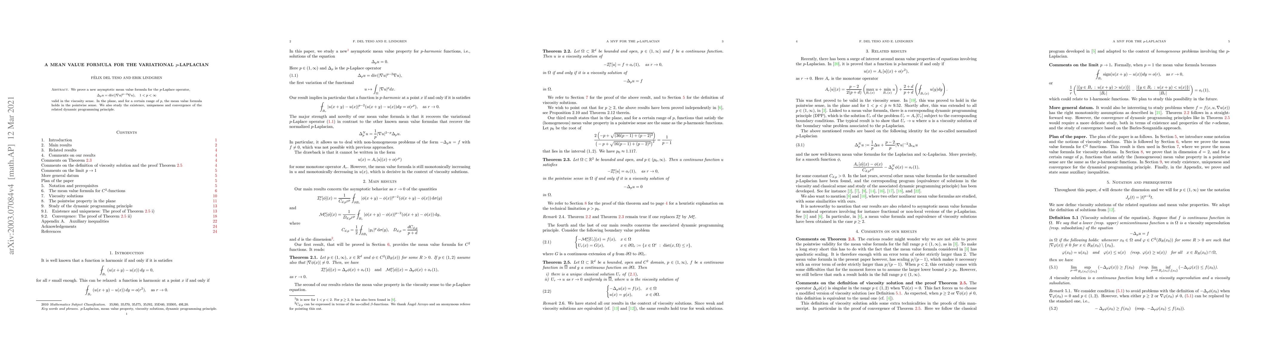 This paper establishes a new asymptotic mean value formula for the variational $p$-Laplacian operator in the viscosity sense, and proves its pointwise validity in the plane for a specific range of $p$. Additionally, it investigates the existence, uniqueness, and convergence of the associated dynamic programming principle.