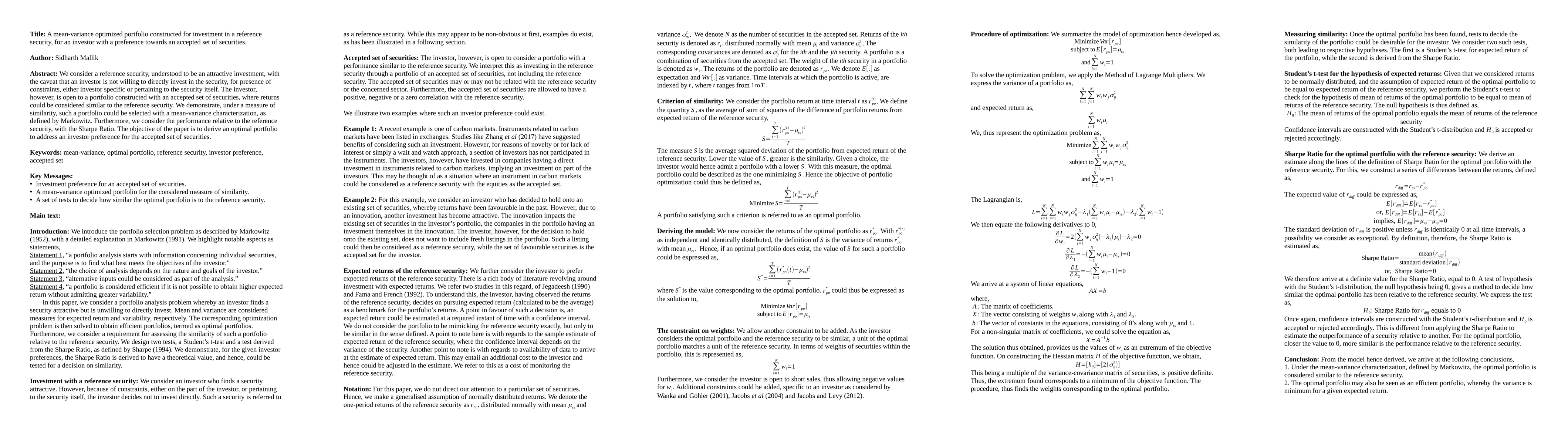 We consider a reference security, understood to be an attractive investment, with the caveat that an investor is not willing to directly invest in the security, for presence of constraints, either investor specific or pertaining to the security itself. The investor, however, is open to a portfolio constructed with an accepted set of securities, where returns could be considered similar to the reference security. We demonstrate, under a measure of similarity, such a portfolio could be selected with a mean-variance characterization, as defined by Markowitz. Furthermore, we consider the performance relative to the reference security, with the Sharpe Ratio. The objective of the paper is to derive an optimal portfolio to address an investor preference for the accepted set of securities.
