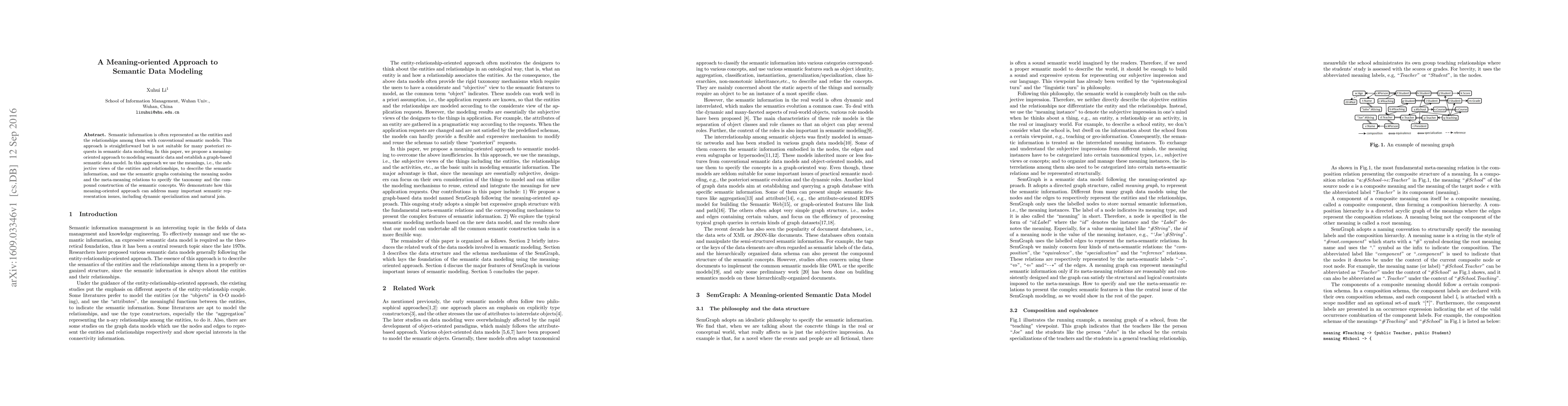 This paper proposes a meaning-oriented approach for semantic data modeling, utilizing subjective views of entities and relationships to describe semantic information. It establishes a graph-based model with meaning nodes and meta-meaning relations, addressing issues like dynamic specialization and natural join.