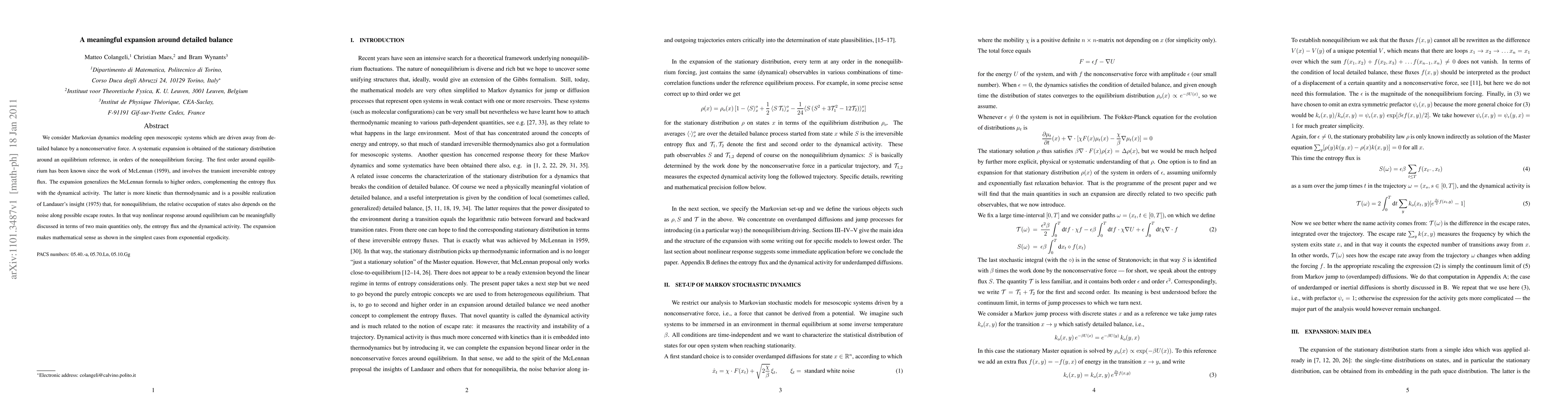 We consider Markovian dynamics modeling open mesoscopic systems which are driven away from detailed balance by a nonconservative force. A systematic expansion is obtained of the stationary distribution around an equilibrium reference, in orders of the nonequilibrium forcing. The first order around equilibrium has been known since the work of McLennan (1959), and involves the transient irreversible entropy flux. The expansion generalizes the McLennan formula to higher orders, complementing the entropy flux with the dynamical activity. The latter is more kinetic than thermodynamic and is a possible realization of Landauer's insight (1975) that, for nonequilibrium, the relative occupation of states also depends on the noise along possible escape routes. In that way nonlinear response around equilibrium can be meaningfully discussed in terms of two main quantities only, the entropy flux and the dynamical activity. The expansion makes mathematical sense as shown in the simplest cases from exponential ergodicity.