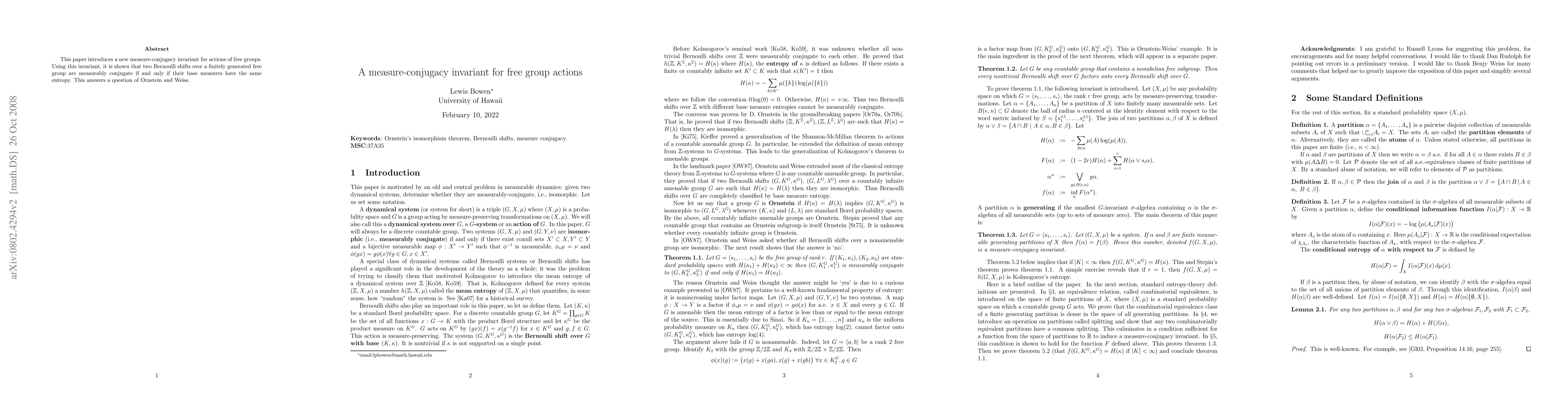 This paper presents a new measure-conjugacy invariant for free group actions, demonstrating that Bernoulli shifts over a finitely generated free group are measurably conjugate if their base measures share the same entropy, thus resolving a question posed by Ornstein and Weiss.