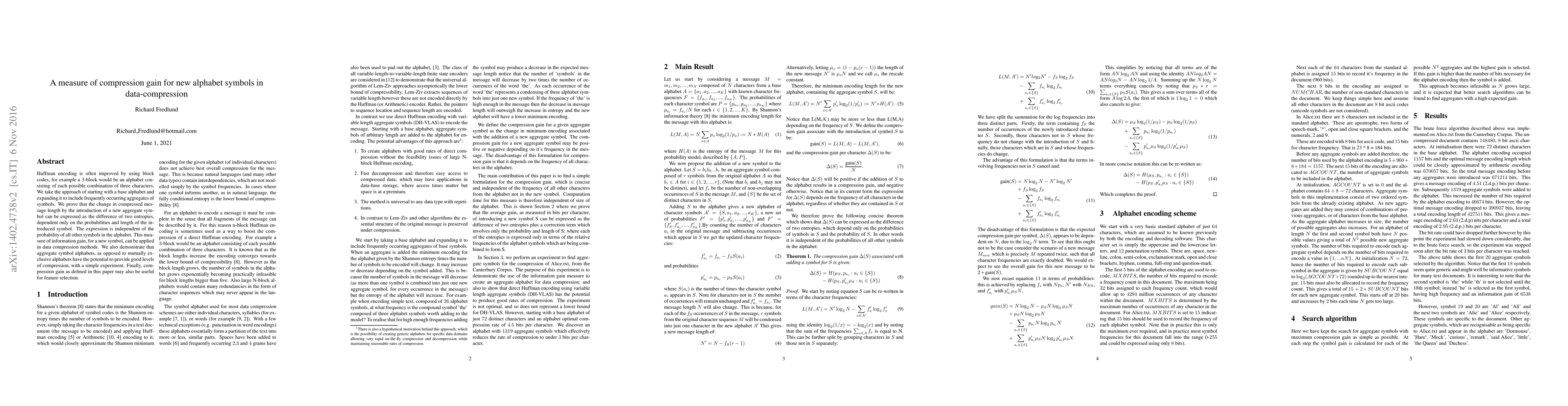This paper proposes a measure of compression gain for new symbols in data-compression, showing that the change in compressed message length due to a new aggregate symbol can be expressed as the difference of two entropies. It demonstrates that aggregate symbol alphabets can achieve good compression levels and suggests this measure may also aid in feature selection.