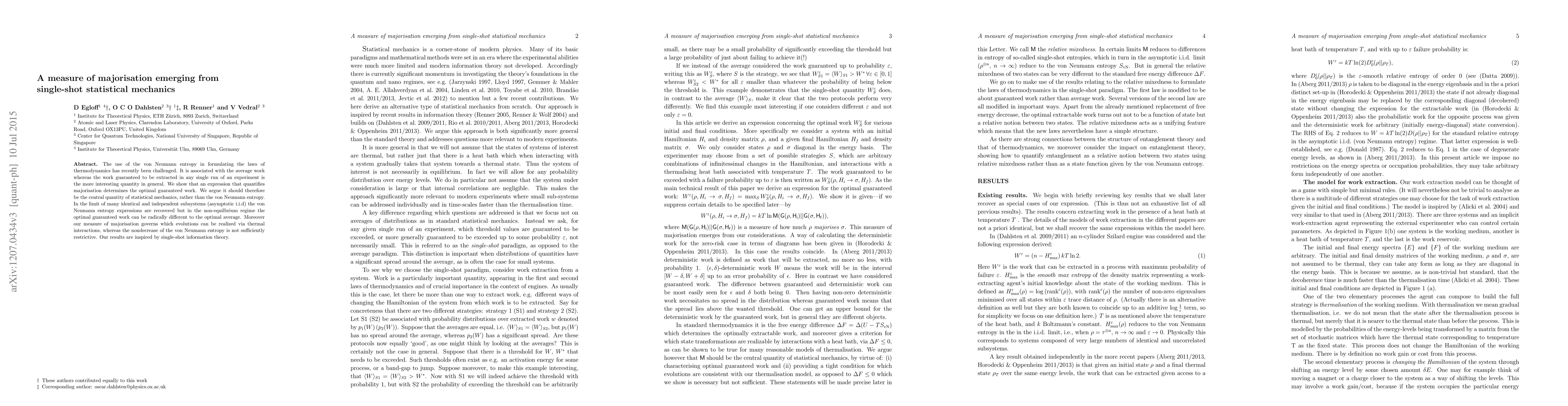 The use of the von Neumann entropy in formulating the laws of thermodynamics has recently been challenged. It is associated with the average work whereas the work guaranteed to be extracted in any single run of an experiment is the more interesting quantity in general. We show that an expression that quantifies majorisation determines the optimal guaranteed work. We argue it should therefore be the central quantity of statistical mechanics, rather than the von Neumann entropy. In the limit of many identical and independent subsystems (asymptotic i.i.d) the von Neumann entropy expressions are recovered but in the non-equilbrium regime the optimal guaranteed work can be radically different to the optimal average. Moreover our measure of majorisation governs which evolutions can be realized via thermal interactions, whereas the nondecrease of the von Neumann entropy is not sufficiently restrictive. Our results are inspired by single-shot information theory.