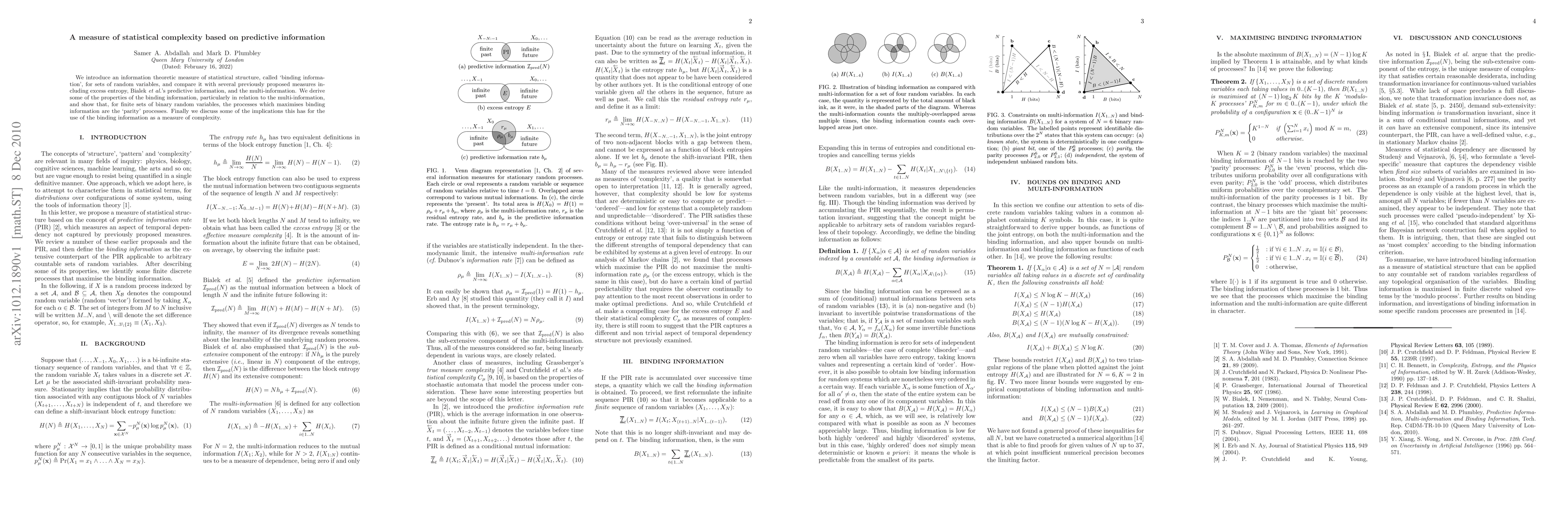 This paper introduces "binding information" as a new measure of statistical complexity based on predictive information, comparing it with existing measures like excess entropy and predictive information. It finds that for binary random variables, "parity" processes maximize binding information, suggesting its potential as a useful complexity metric.