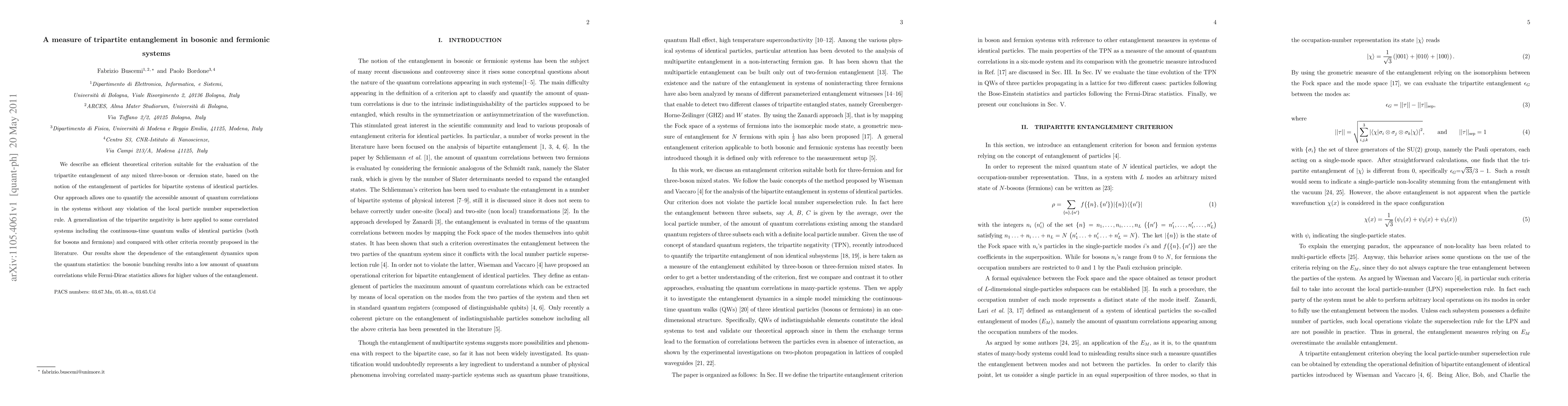 This paper introduces a method to measure tripartite entanglement in bosonic and fermionic systems, finding that bosons exhibit lower quantum correlations than fermions.