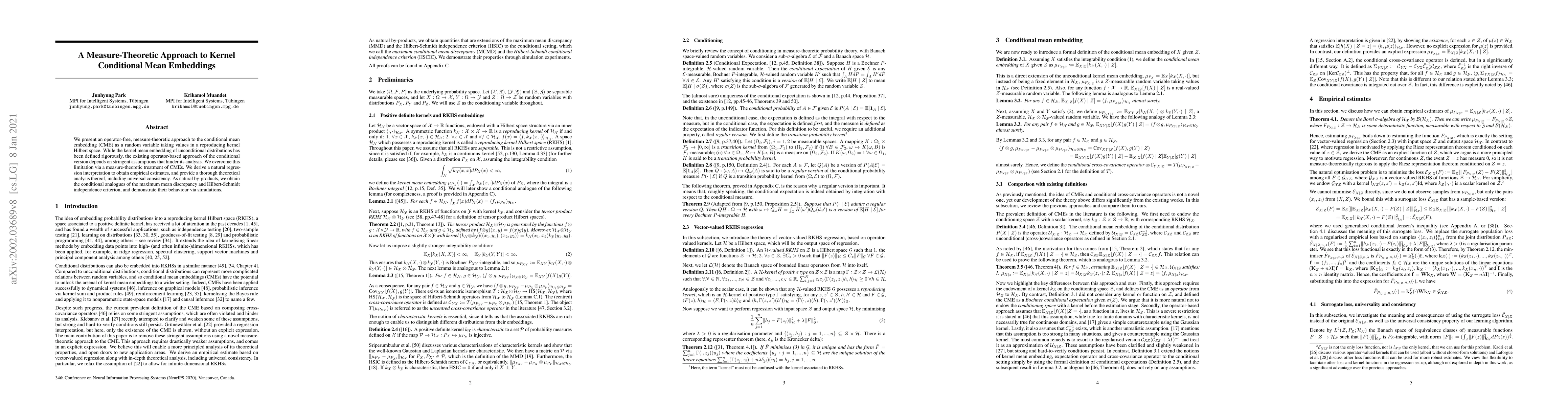 This paper proposes a measure-theoretic approach to define kernel conditional mean embeddings without relying on operators, offering a regression interpretation for empirical estimates and proving universal consistency. It also derives conditional analogues of maximum mean discrepancy and Hilbert-Schmidt independence criterion.