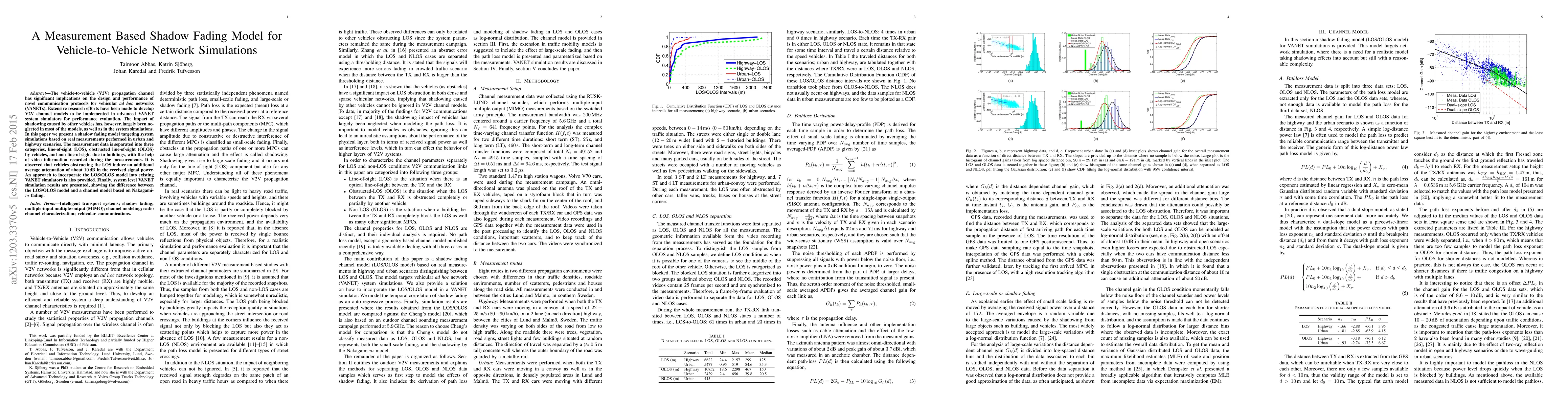 The vehicle-to-vehicle (V2V) propagation channel has significant implications on the design and performance of novel communication protocols for vehicular ad hoc networks (VANETs). Extensive research efforts have been made to develop V2V channel models to be implemented in advanced VANET system simulators for performance evaluation. The impact of shadowing caused by other vehicles has, however, largely been neglected in most of the models, as well as in the system simulations. In this paper we present a shadow fading model targeting system simulations based on real measurements performed in urban and highway scenarios. The measurement data is separated into three categories, line-of-sight (LOS), obstructed line-of-sight (OLOS) by vehicles, and non line-of-sight due to buildings, with the help of video information recorded during the measurements. It is observed that vehicles obstructing the LOS induce an additional average attenuation of about 10 dB in the received signal power. An approach to incorporate the LOS/OLOS model into existing VANET simulators is also provided. Finally, system level VANET simulation results are presented, showing the difference between the LOS/OLOS model and a channel model based on Nakagami-m fading.
