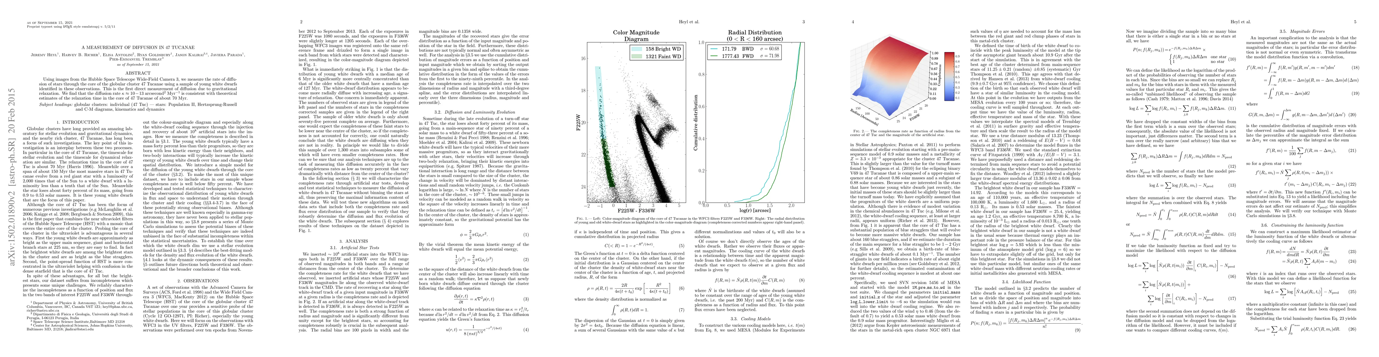 This study measures the diffusion rate of stars in the globular cluster 47 Tucanae using Hubble Space Telescope data, finding a rate of $\kappa\approx 10-13$ arcsecond$^2$ Myr$^{-1}$, which aligns with theoretical predictions of the cluster's relaxation time of around 70 Myr.