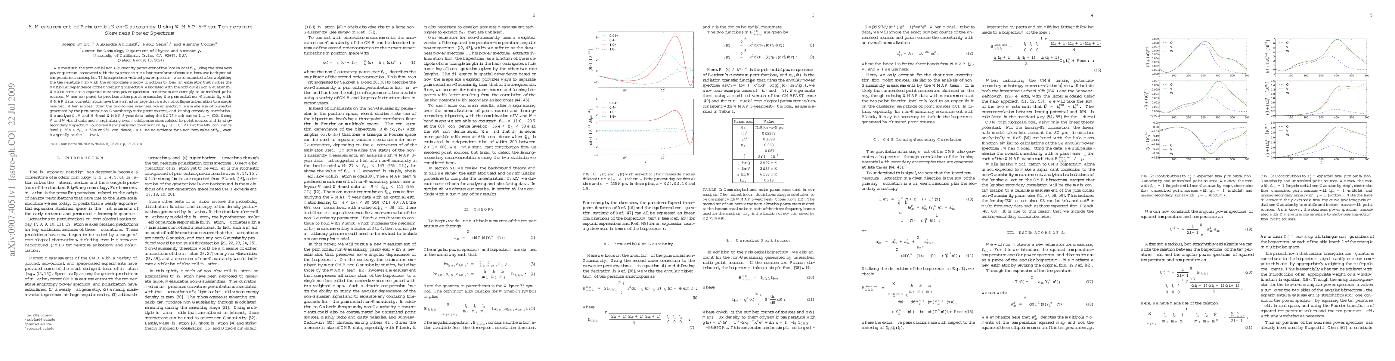 This paper measures primordial non-Gaussianity using the WMAP 5-year temperature skewness power spectrum, finding no significant evidence for a non-zero value of the local model parameter f_{NL}. The study provides a range of -36.4 < f_{NL} < 58.4 at 95% confidence, indicating no strong detection of primordial non-Gaussianity.