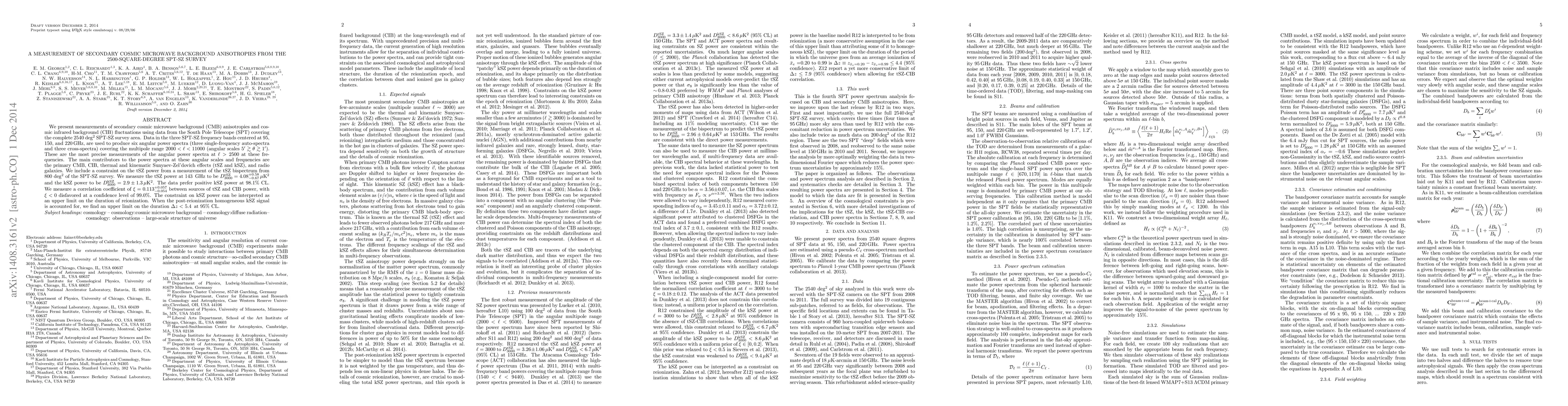 This paper reports precise measurements of secondary cosmic microwave background anisotropies using the South Pole Telescope's 2540 sq.deg. SPT-SZ survey data, revealing significant contributions from the primary CMB, CIB, and tSZ/kSZ effects. The study finds an upper limit on the duration of reionization at Δz < 5.4 at 95% confidence.