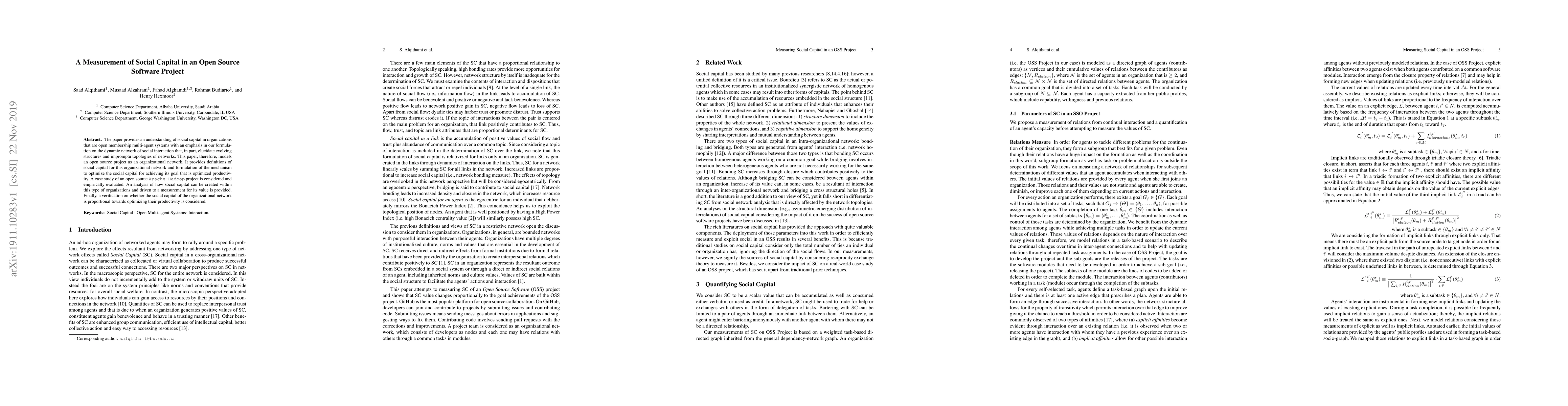 A novel measurement approach for social capital in OSS development is proposed, which takes into account the benevolence between autonomous agents.