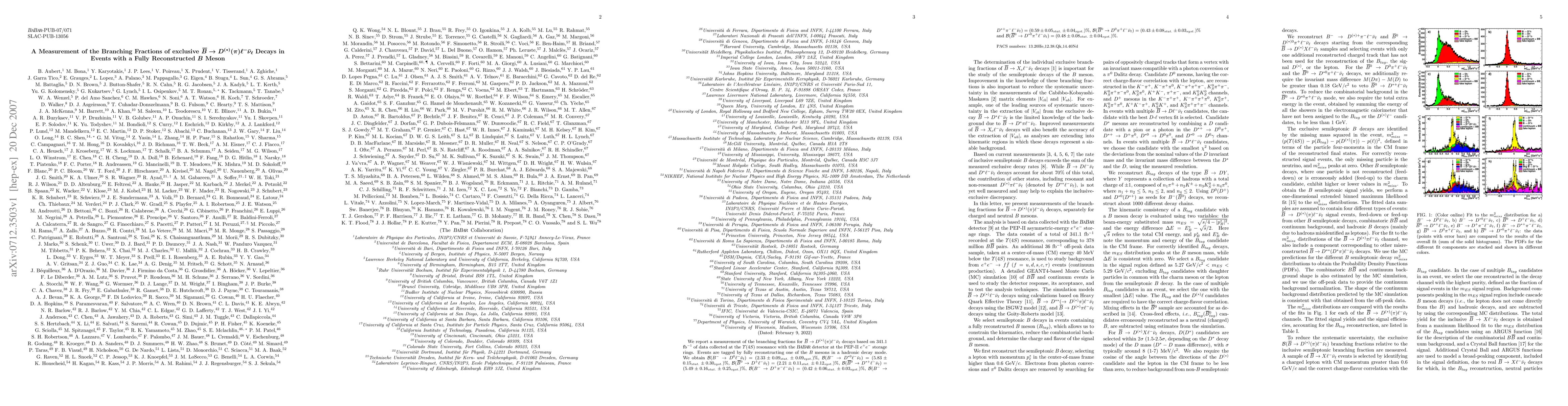 This study measures the branching fractions for exclusive B meson decays into D(*)(pi)l-nubar using 341.1 fb-1 of data from the Upsilon(4S) resonance, finding significant values for various decay modes, including B(B- -> D0l-nubar) = (2.33 +/- 0.09)% and B(B0bar -> D*0pi+l-nubar) = (0.48 +/- 0.08)%.