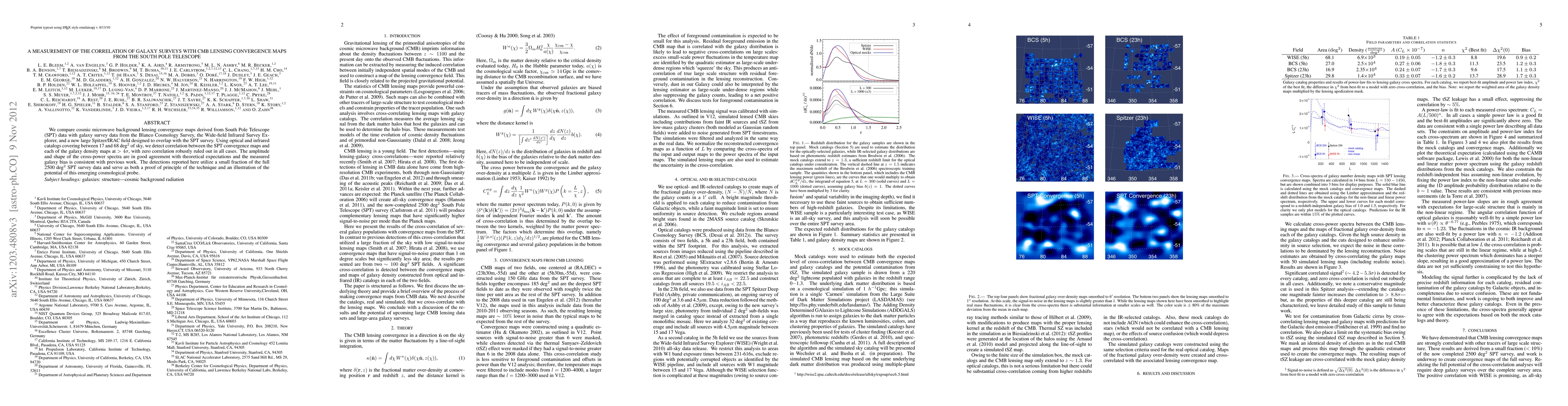 This paper measures the correlation between cosmic microwave background lensing convergence maps from the South Pole Telescope and galaxy survey data, finding significant correlations at >4 sigma. The results align with theoretical predictions and demonstrate the potential of this method for future cosmological studies.